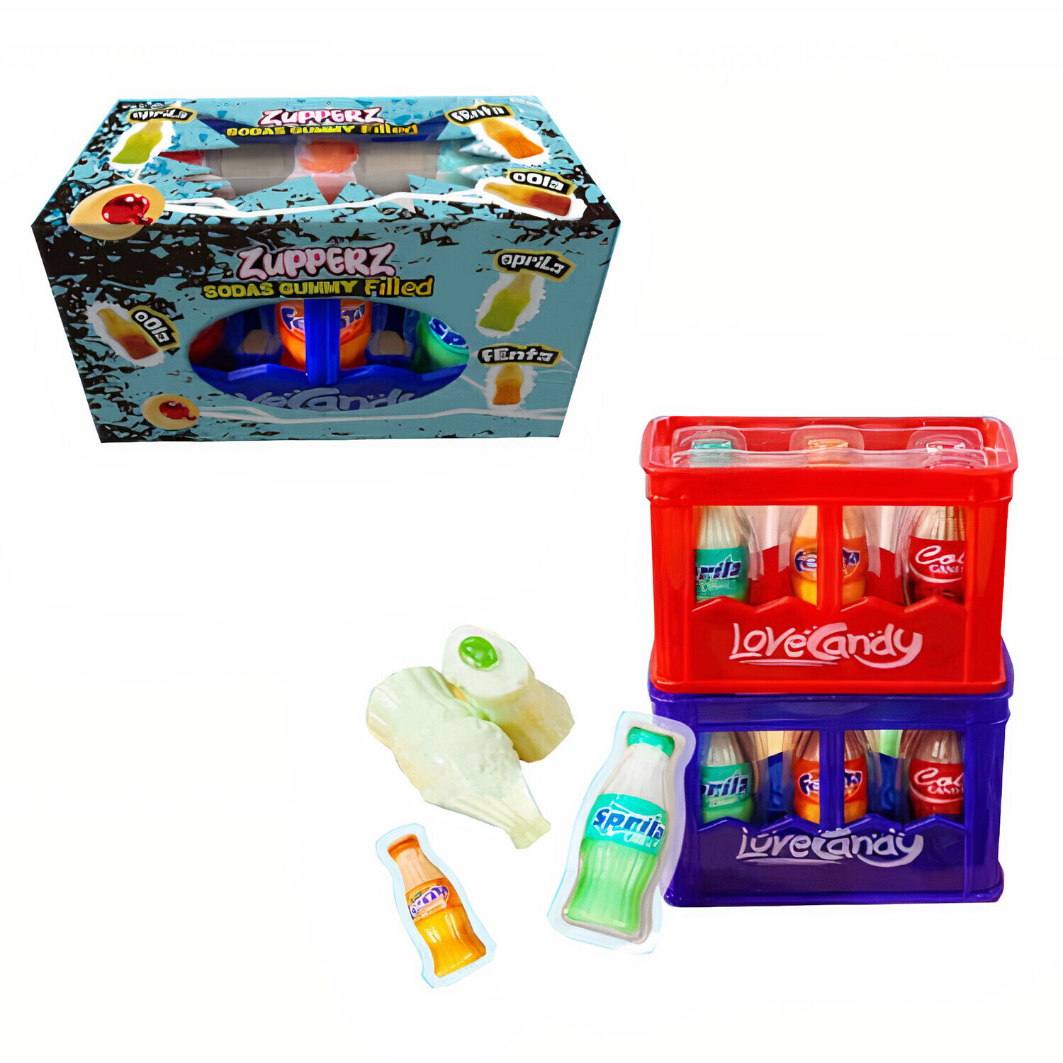 Zutaten: Glukosesirup, Kristallzucker, Wasser, Gelatine, Sorbit, Konzentrierter Saft, Zitronensäure, DL-Malinsäure, Agar, Glycerin, Natriumcitrat, Kaliumsorbat, Pflanzenöl, Carnaubawachs, Aroma (E110, Tartrazin E102, Brillantblau E133, Karamell E150d).