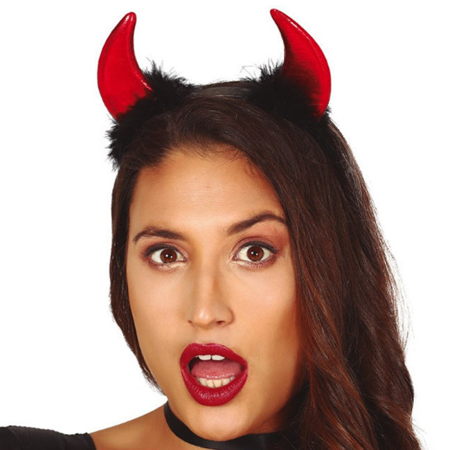 Ein schwarzer Haarreif mit zwei kleinen Hörnern aus rotem Metallic-Stoff mit Polsterung. Es wird mit schwarzem Haar geliefert und ist ein Must-Have, wenn Sie sich in der gruseligsten Nacht des Jahres oder auf einer Mottoparty in einen Teufel oder Kobold verwandeln wollen.