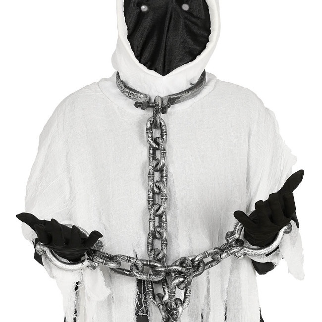 Fesseln in silberner Ausführung, die geschwärztes Metall simuliert, mit einer größeren Fessel für den Hals und zwei kleineren für die Handgelenke. Perfekt, um ein Gefangenen-, Geister- oder Attentäterkostüm zu vervollständigen.