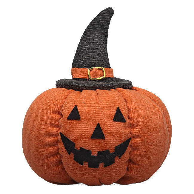 - Kürbis mit geschnitztem Gesicht und Hexenhut in Schwarz mit goldener Schnalle.
