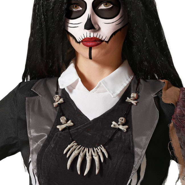 • Halskette bestehend aus Totenköpfen und Zähnen aus Kunststoff.