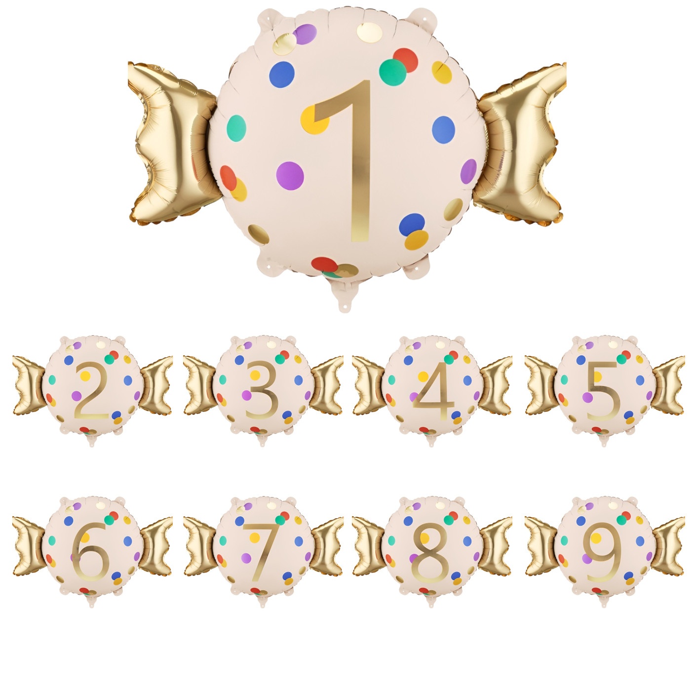 Dekorativer Ballon mit der Zahl 1 in einer eleganten Beige?Gold?Kombination. Das Candy?Design mit bunten Punkten verleiht eine festliche und zugleich edle Note. Größe vor dem Aufblasen ca. 76,5 x 48 cm; nach dem Aufblasen ca. 61 x 37 cm. Für Luft- und Heliumbefüllung geeignet und so konzipiert, dass er für Sie zum Blickfang Ihrer Feier wird. Ideal für den ersten Geburtstag, Fotoshootings und zur Dekoration von Candy?Bars oder besonderen Bereichen.
