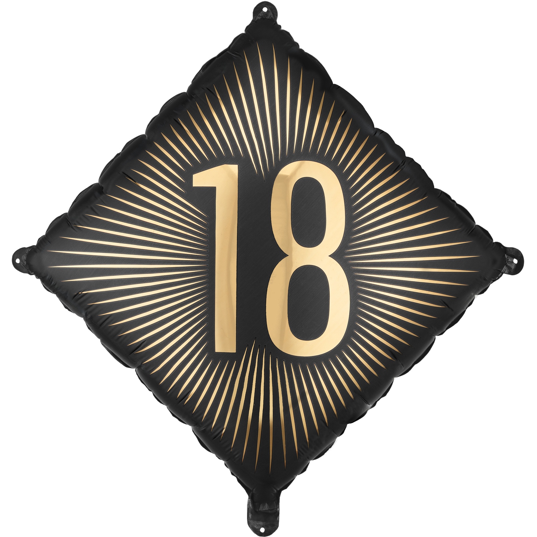 Metallic-Folienballon in Schwarz mit der goldenen Zahl "18" in der Mitte, konzipiert als auffälliges Dekorationselement für Volljährigkeitsfeiern. Ungefähre Maße vor dem Aufblasen: 54 x 54 cm (20 x 20"), nach dem Aufblasen: 46 x 46 cm (18 x 18"). Kann je nach Dekorationsbedarf mit Luft oder Helium gefüllt werden. Inklusive Strohhalm zum einfachen Aufblasen.