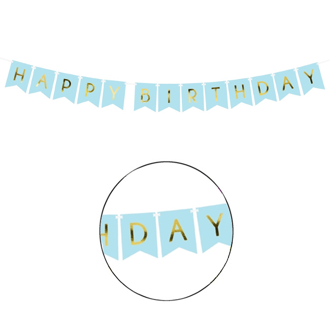 Diese Girlande besteht aus mehreren Pappstücken in Form einer zweispitzigen Flagge, die jeweils mit einem goldfarbenen Buchstaben versehen sind. Die verschiedenen Wimpel sind miteinander verbunden und bilden so das Happy-Birthday-Zeichen.