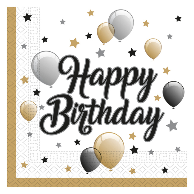 Happy Birthday Goldene Servietten mit Luftballons 16,5 x 16,5 cm - 20 Stk.