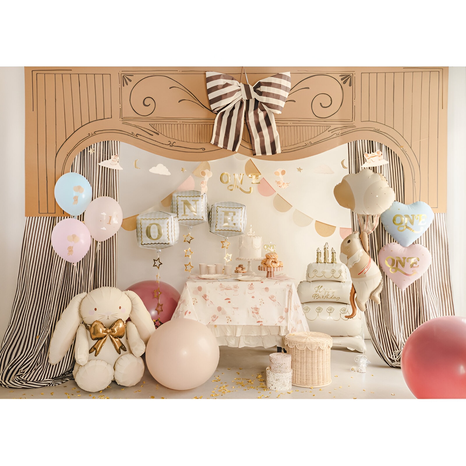 Foil Balloon Bunny in Creme- und Hellrosa-Tönen mit goldener Schleife - entworfen, um Babyshowers und Taufen eine zarte, elegante Note zu verleihen. Vor dem Aufblasen misst der Ballon ca. 104,5 x 99 cm; aufgeblasen erreicht er etwa 74 x 84 cm. Er ist für das Aufblasen mit Luft vorgesehen und bietet eine definierte Form sowie eine glänzende Oberfläche, die in jeder Dekoration auffällt.