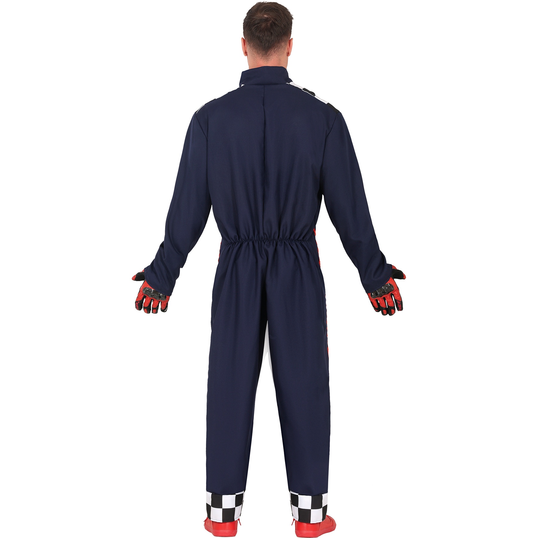Herren Rennfahrer-Kostüm. Es besteht aus einem langärmeligen Overall, der vorne mit einem Reißverschluss geschlossen wird.