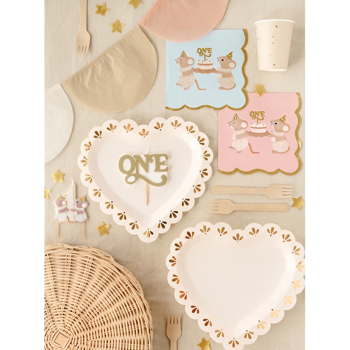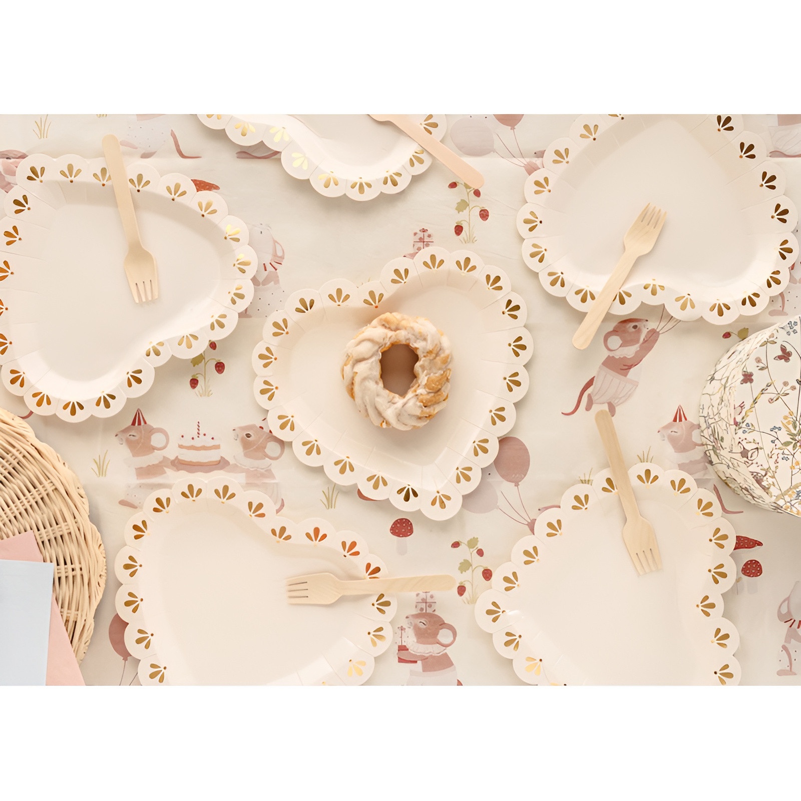 Pappteller in Herzform in Creme mit goldenen Details, die eine romantische und zugleich raffinierte Note verleihen. Das edle Finish hebt die Tischpräsentation bei Hochzeiten und formellen Feiern hervor. Die Größe eignet sich für Vorspeisen, Desserts und kleine Häppchen und sorgt für eine gepflegte Optik. Als Einwegprodukt erleichtern diese Teller Ihnen das Eindecken und den Service bei Veranstaltungen, ohne auf Stil verzichten zu müssen.