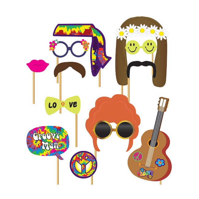 Eine Packung mit 12 Pappstücken, die mit einem Stock befestigt sind und die Sie für den Fotocall auf Ihrer Hippie-Party verwenden können.