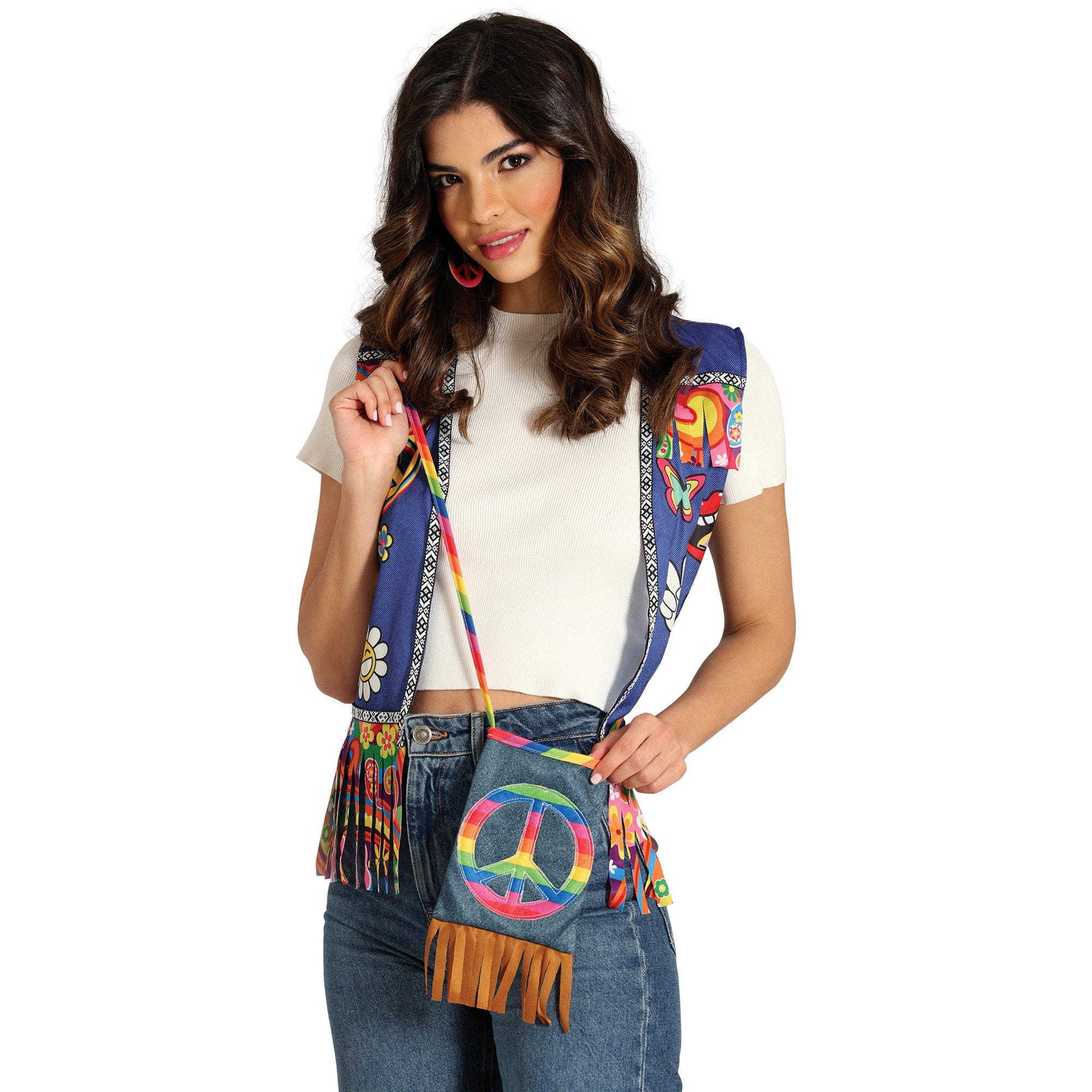 Ideales Accessoire für Hippie-Looks und Kostüme. Retro-Umhängetasche mit aufgenähtem Peace-Symbol in leuchtenden Farben und Fransen am unteren Rand. Hergestellt aus strapazierfähigem, pflegeleichtem Polyester. Kompakte Maße von 27 x 15 cm - perfekt, um Ihre wichtigsten Dinge auf Partys, beim Karneval oder auf Festivals mitzunehmen. Umhängeriemen für Schulter- oder Crossbody-Trageweise, der Komfort bietet und jedem Outfit einen Boho-Touch verleiht.