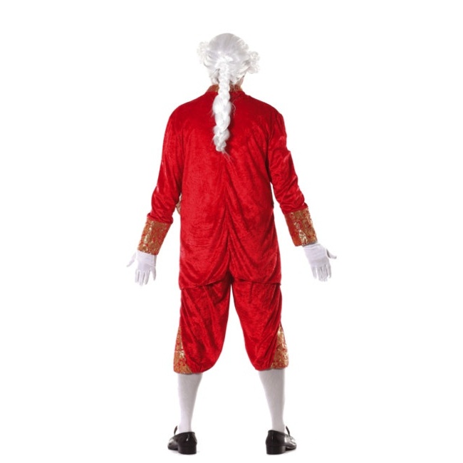 Die Hose ist aus dem gleichen roten Samtstoff wie die Jacke im Rückenbereich. Sie hat einen Bund in der Taille und reicht bis etwa unterhalb der Knie.