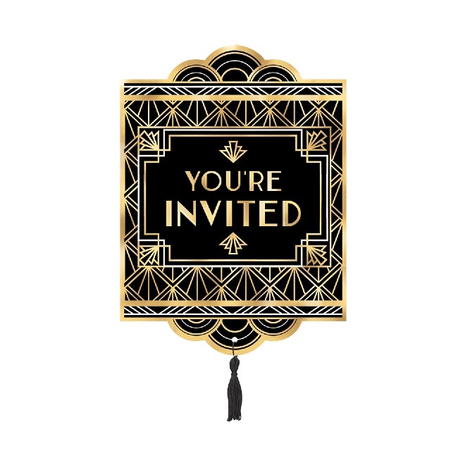 Diese Einladungen sind perfekt geeignet, um Ihre Gäste zur Teilnahme an Ihrer Party zu bewegen. Wenn Sie eine Party im Hollywood-Stil veranstalten, enthält diese Packung 8 Einladungen im Postkartenstil mit einem schwarz-goldenen und weißen Design. An der Unterseite befindet sich eine kleine schwarze Quaste.