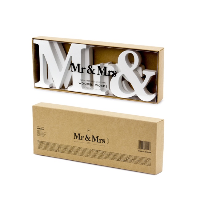 Dieses Holzschild ist der Form des Schildes "Mr & Mrs" in Weiß und Serifenschrift nachempfunden.