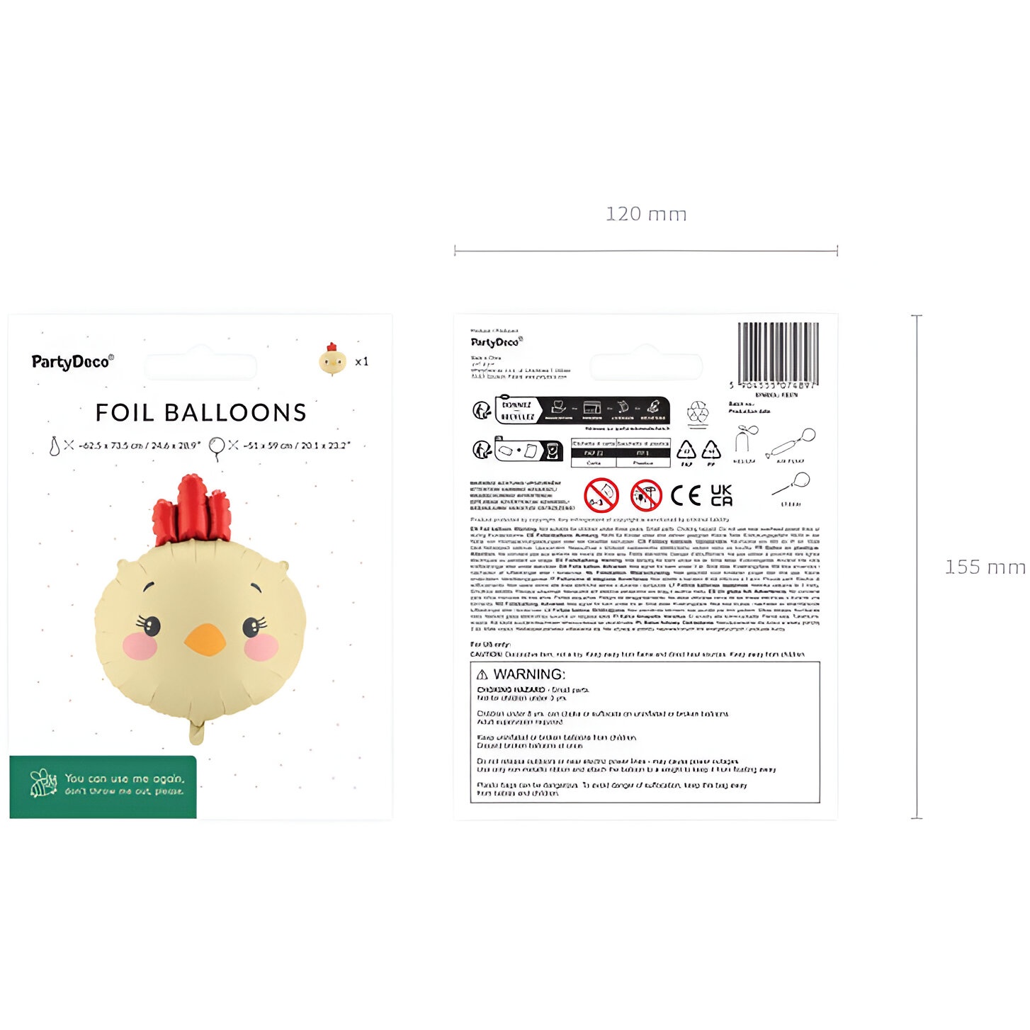 Foil-Ballon mit Hühnchen-Motiv in Gelb- und Rottönen, mit rosigen Wangen und 3D-Kamm für ein fröhliches, niedliches Erscheinungsbild.