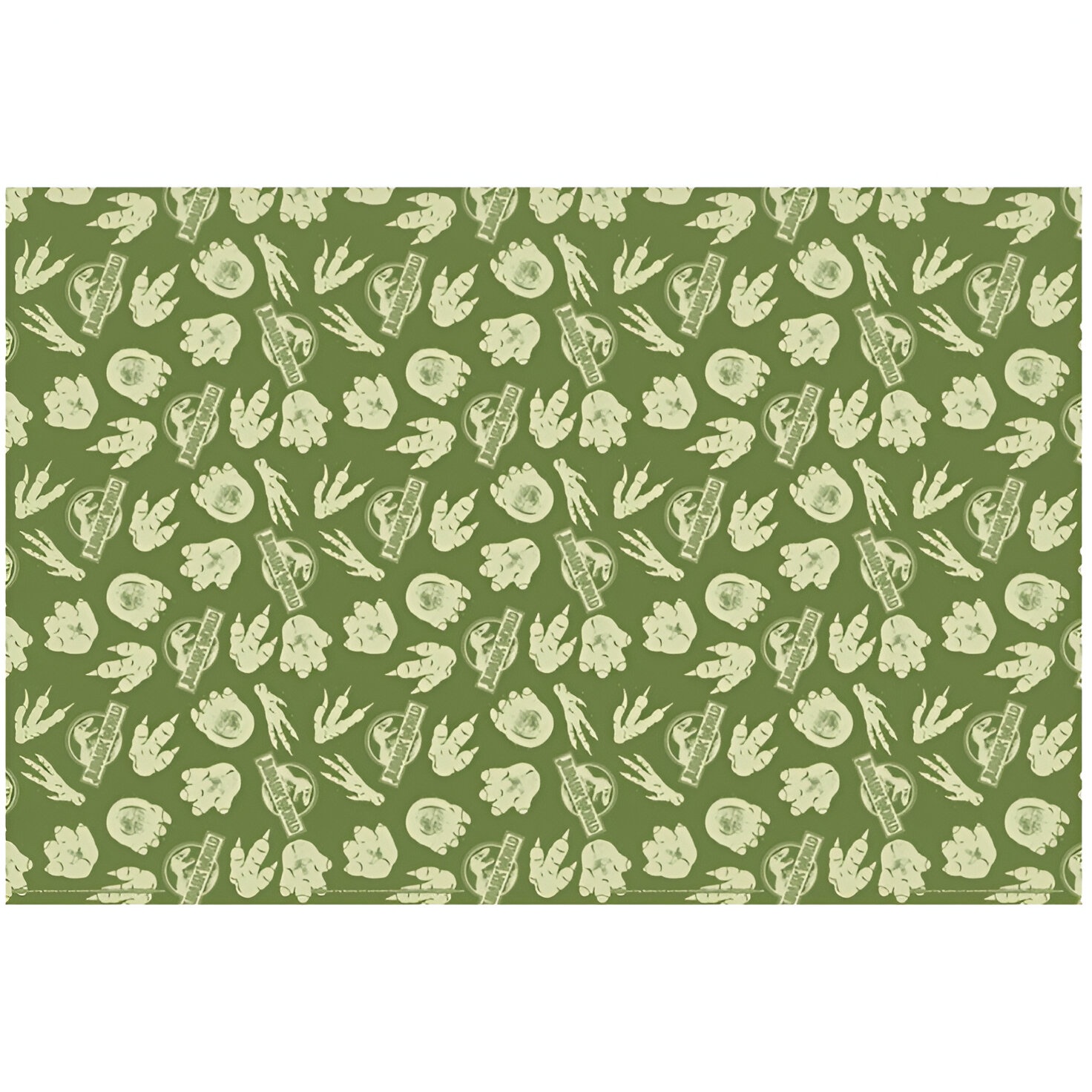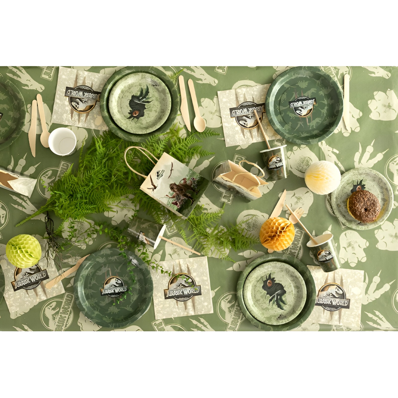 - Offizielles Jurassic World-Design mit Dinosaurier-Motiven und Fußspuren in Grüntönen.