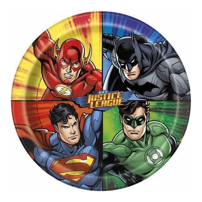 Jede Packung enthält 8 Pappteller mit einem auffälligen, farbenfrohen Aufdruck, der Superman, Batman, Green Lantern und Flash zeigt.