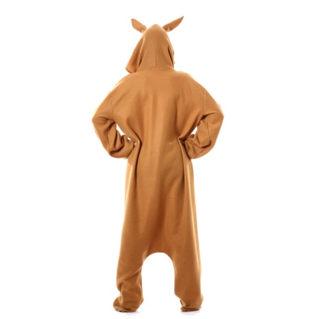 Dies ist ein kompletter Känguru-Overall in Hellbraun mit dem charakteristischen Design eines Kängurus. Auf der hellbraunen Vorderseite sieht es aus wie ein typischer Känguru-Beutel, aus dem der Kopf und die Hände eines Baby-Kängurus herausragen.