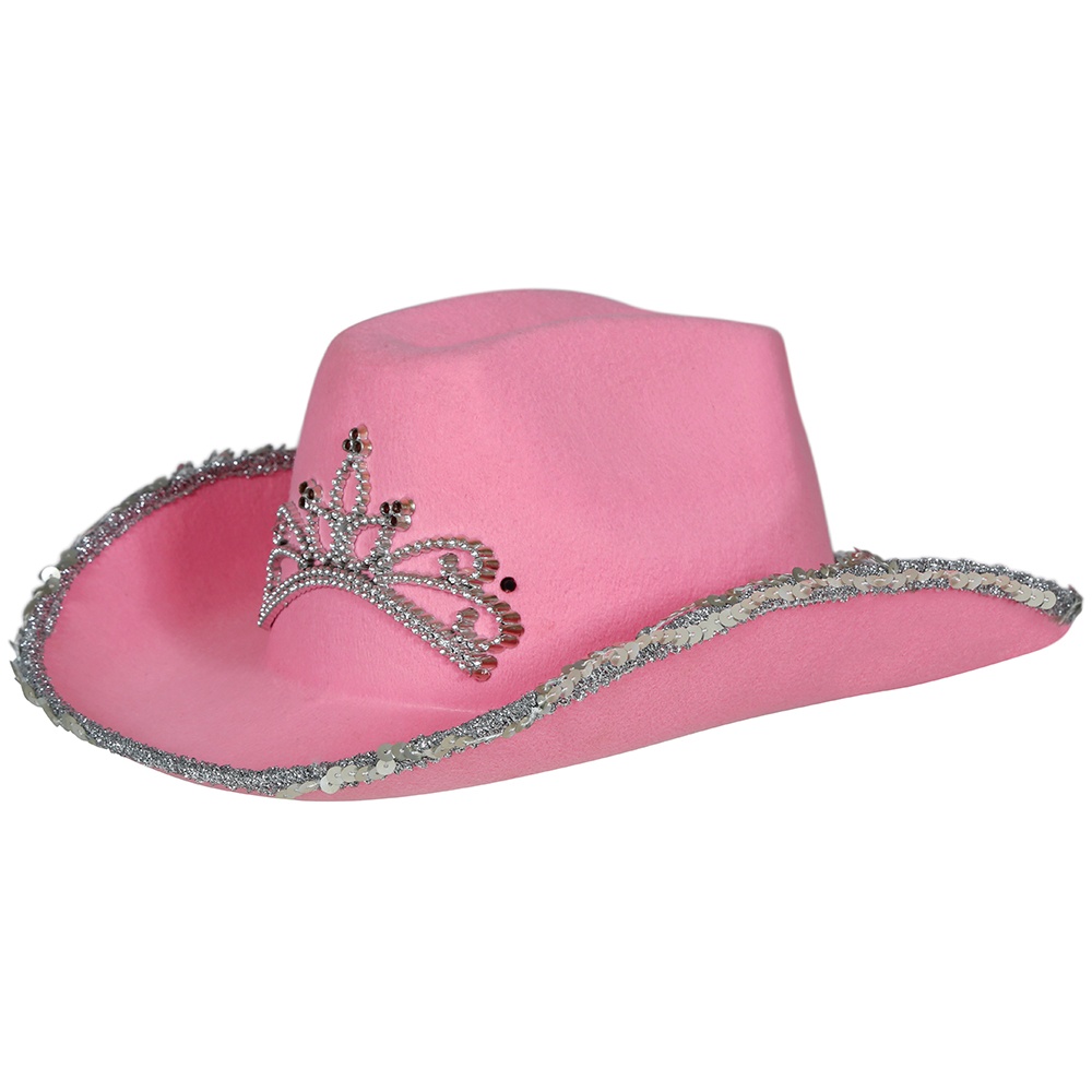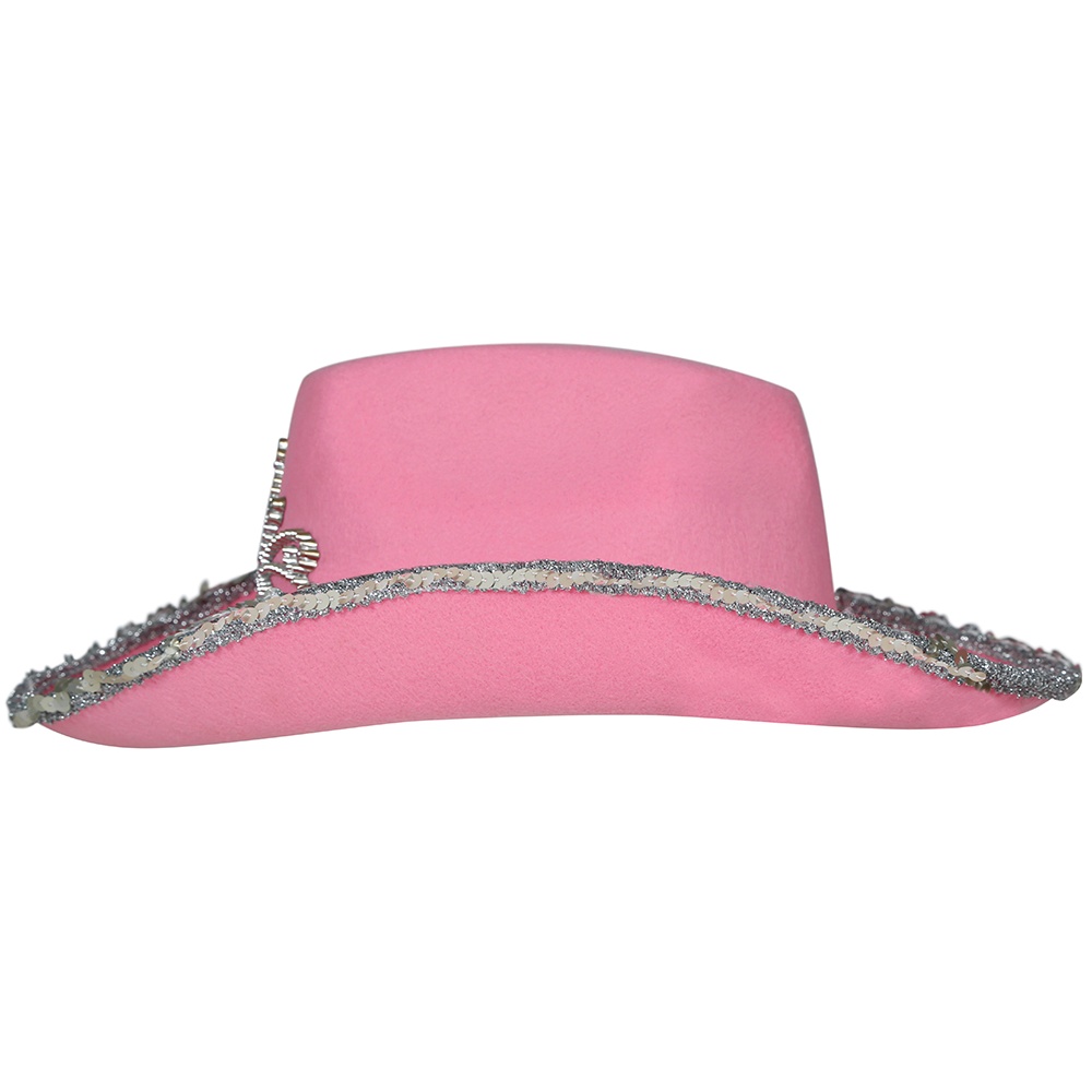 Rosa Cowboyhut für Mädchen, die sich ein verspieltes und glitzerndes Accessoire wünschen. Er verfügt über eine silberne Paillettenborte am Rand und eine tiaraähnliche Verzierung mit Schmucksteinen auf der Hutkrone, die einen Prinzessinnen-Cowboy-Look erzeugt.