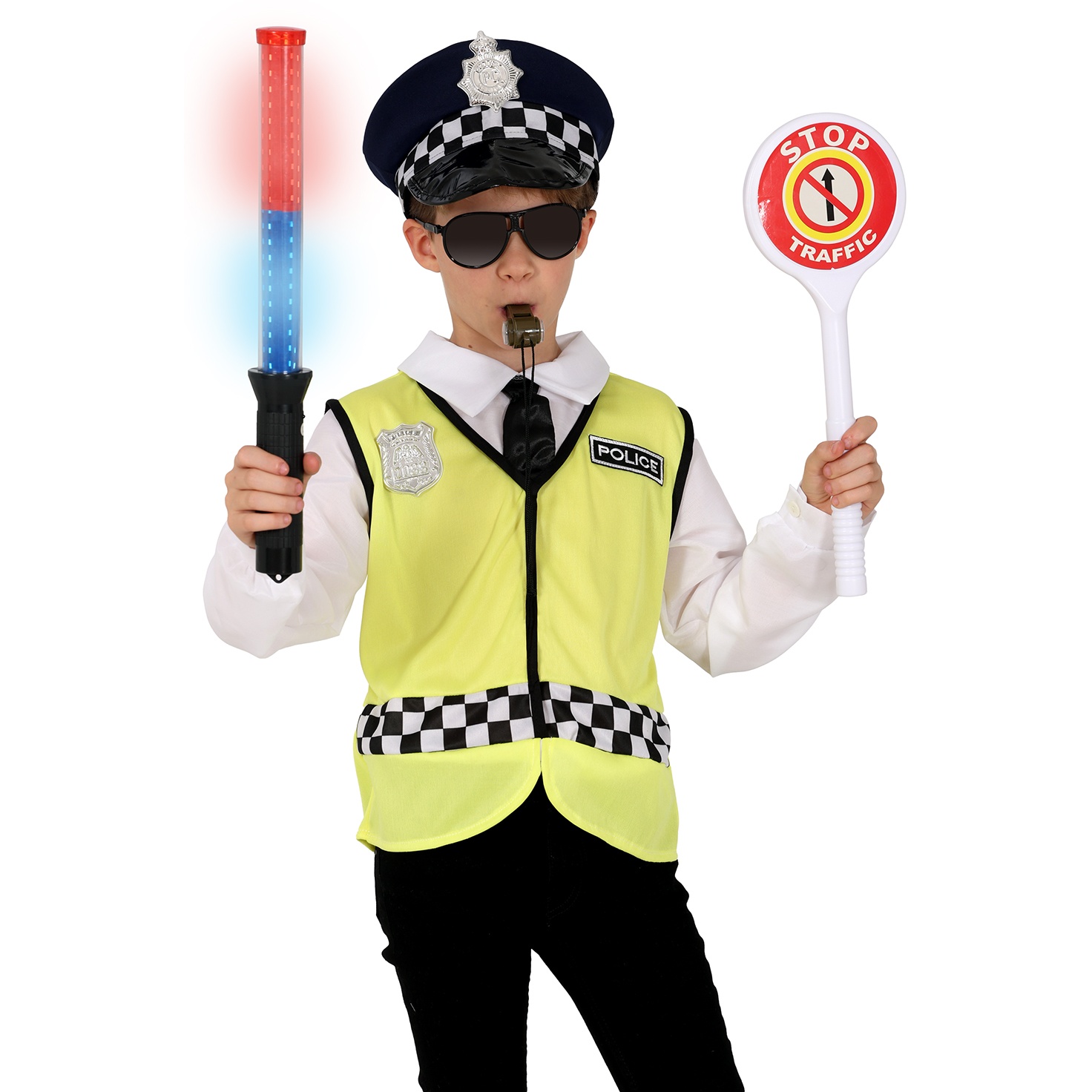 - Enthält: Leuchtstab, Stopp-Schild, Sonnenbrille, Abzeichen, Pfeife