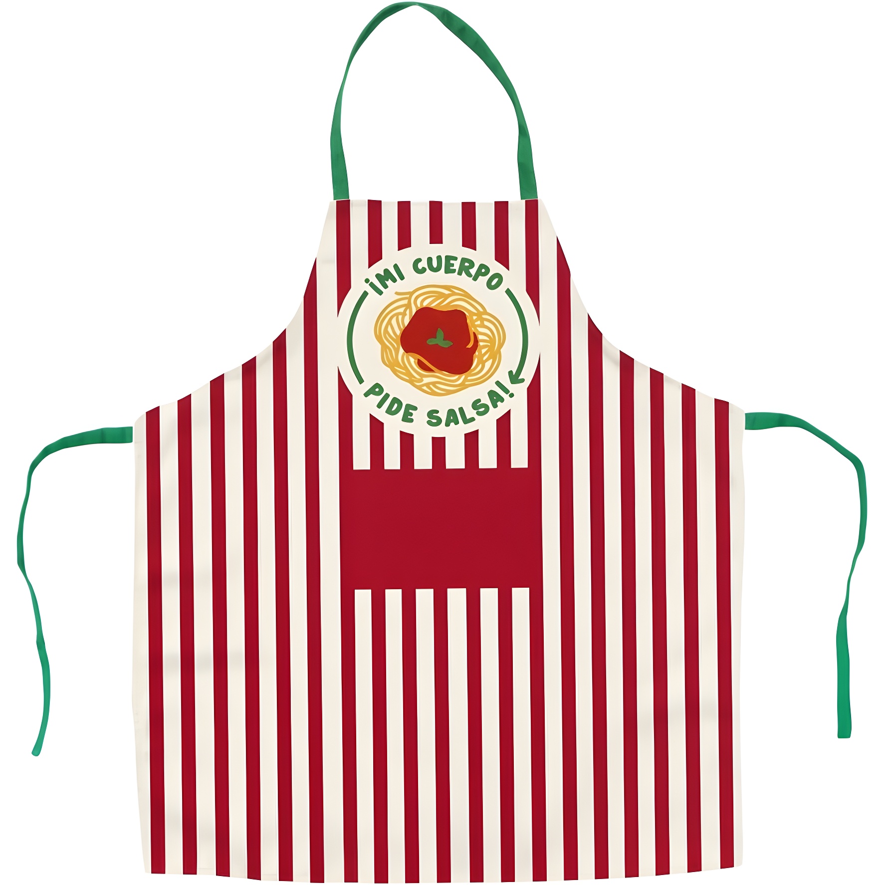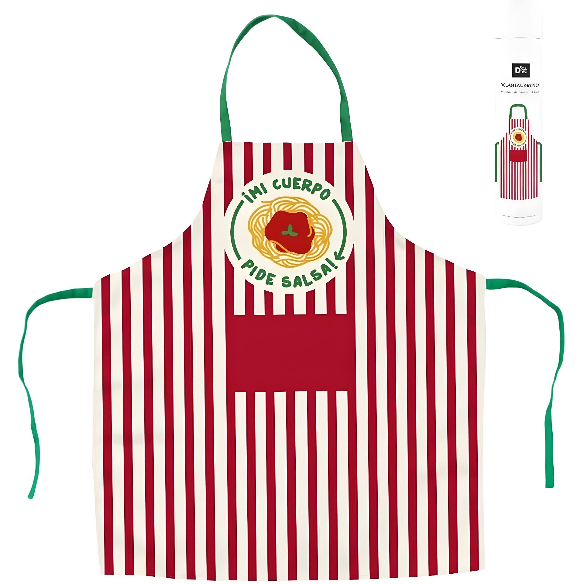 Kinderschürze mit dem witzigen Aufdruck '¡Mi cuerpo pide salsa!', gedacht für kleine Köche im Alter von 4 bis 8 Jahren. Das gestreifte Design und das Pastamotiv sorgen beim Kochen oder Basteln für eine fröhliche, originelle Note.