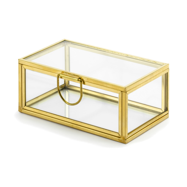 Die Schachtel ist aus transparentem Glas mit goldfarbenen Metallrändern gefertigt. Ein origineller Artikel, der sich auch als Geschenk für einen besonderen Tag eignet.