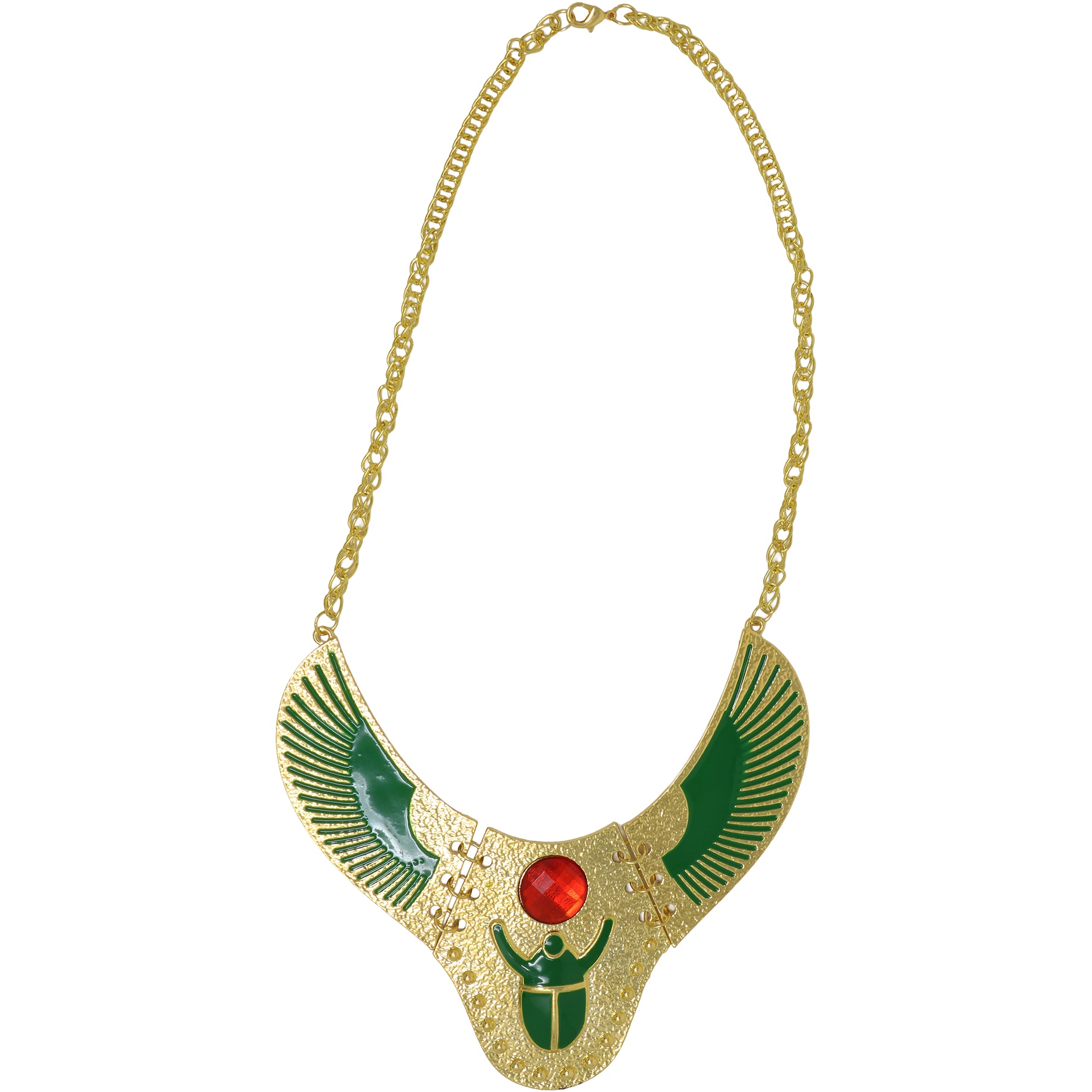Diese Halskette im ägyptischen Stil ist von Kleopatra inspiriert. Das geflügelte Design mit grünen Details und einem zentralen roten Schmuckstein verleiht Ihrem Auftritt Farbe und Eleganz. Ideal, um Ihr ägyptisches Königinnen-Kostüm bei Karneval, Themenpartys, im Theater oder bei Fotoshootings zu vervollständigen. Sie sorgt für einen sofortigen visuellen Effekt und betont jedes Outfit mit antikem Ägypten-Flair.