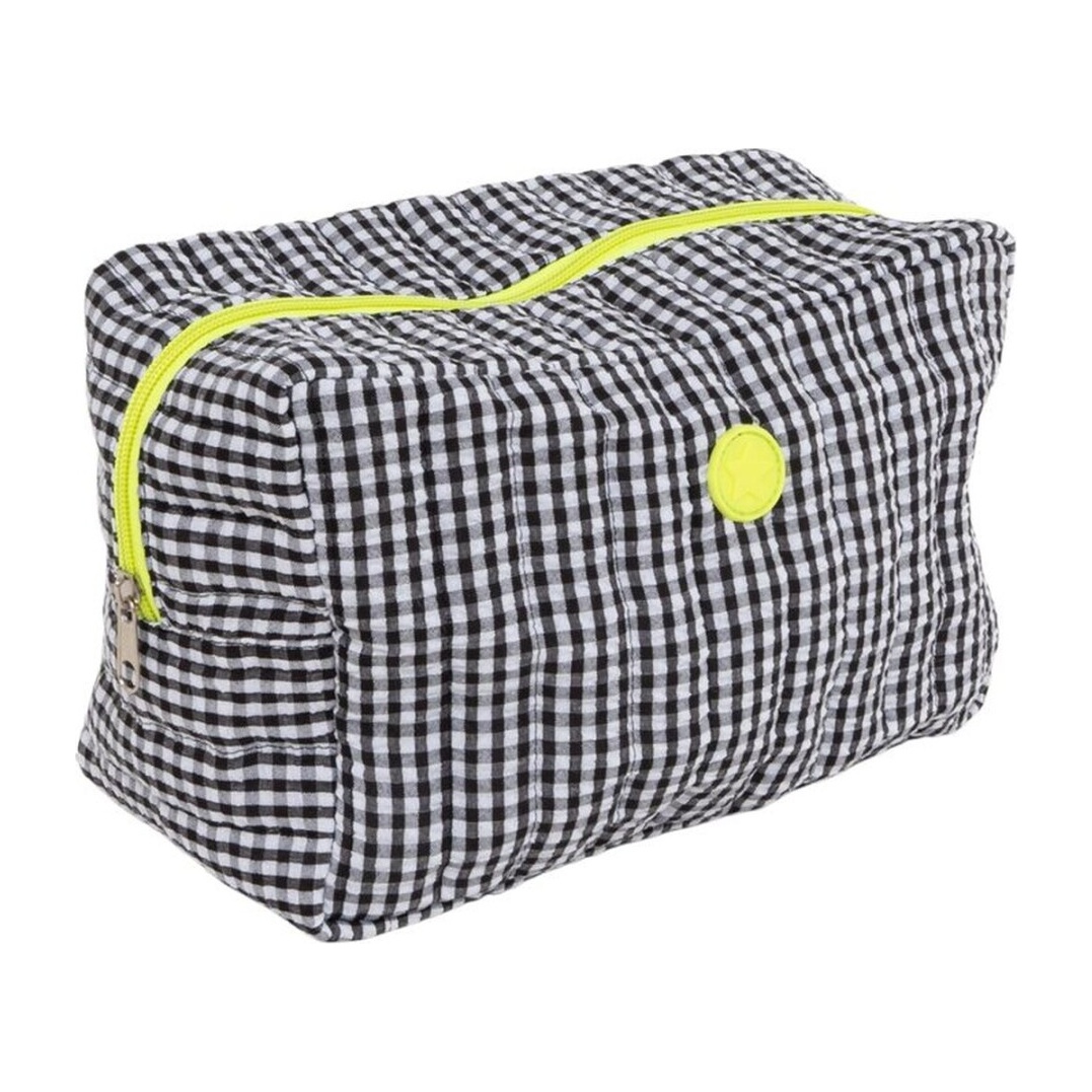 Kulturtasche mit Vichy-Muster in Schwarz-Weiß und einem neonfarbenen Reißverschluss, der einen modernen und auffälligen Akzent setzt. Großzügiges, rechteckiges Design, das für die einfache Organisation von Kosmetik und Accessoires konzipiert wurde. Sie ist leicht und vielseitig, passt zu jedem Gepäck und ist sowohl für den Alltag als auch für Ihre Reisen praktisch.