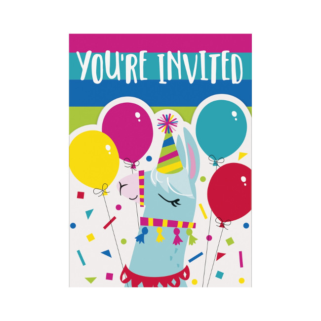 Dieses Produkt besteht aus 8 Einladungen mit einem farbenfrohen Design, das ein lächelndes Lama mit einer festlichen Mütze, Luftballons und buntem Konfetti zeigt, begleitet von den Worten "You're invited" in Englisch. Für eine bessere Präsentation werden 8 weiße Umschläge beigefügt.