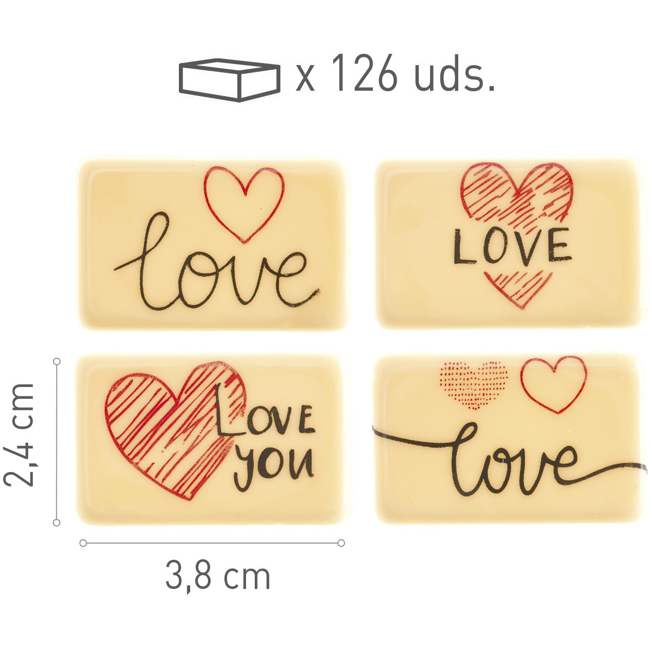 • 126 Schokoladen-Schriftzüge mit verschiedenen Love-Motiven.
