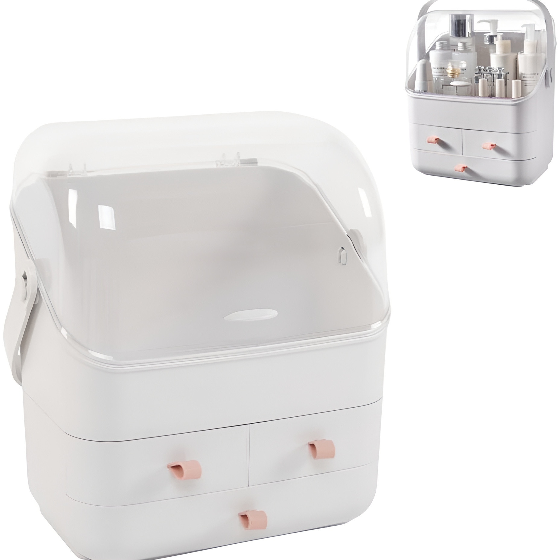Dieser Kosmetik-Organizer wurde entwickelt, damit Sie Ihre Pflege- und Make-up-Produkte stets griffbereit und sichtbar aufbewahren können. Der transparente Staubschutzdeckel ermöglicht die Identifikation des Inhalts ohne Öffnen, während die Schubladen getrennte Fächer für mehr Ordnung bieten. Kompakt und mit seitlichem Griff ist er leicht zu transportieren und verleiht Ihrem Schminktisch ein modernes, aufgeräumtes Erscheinungsbild.