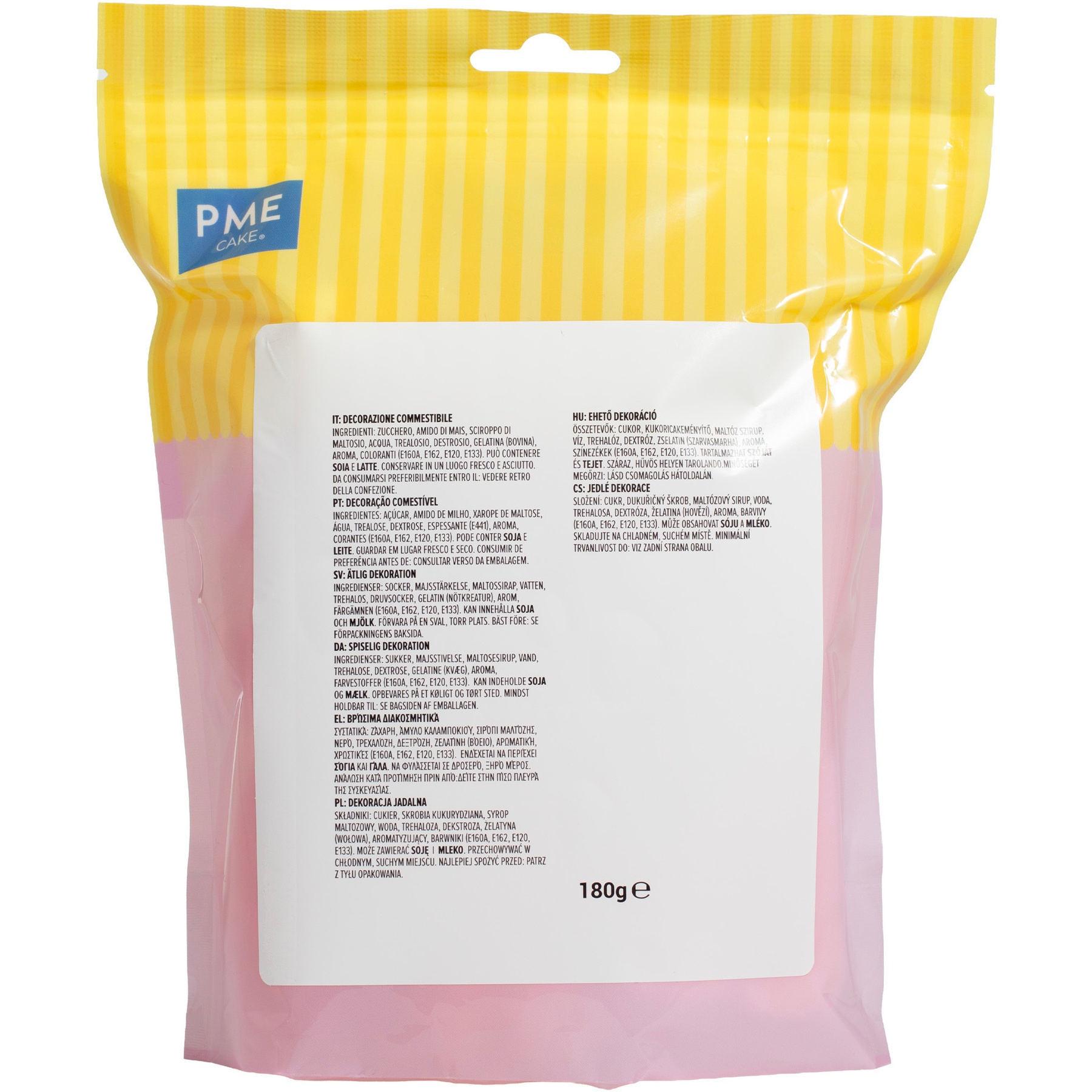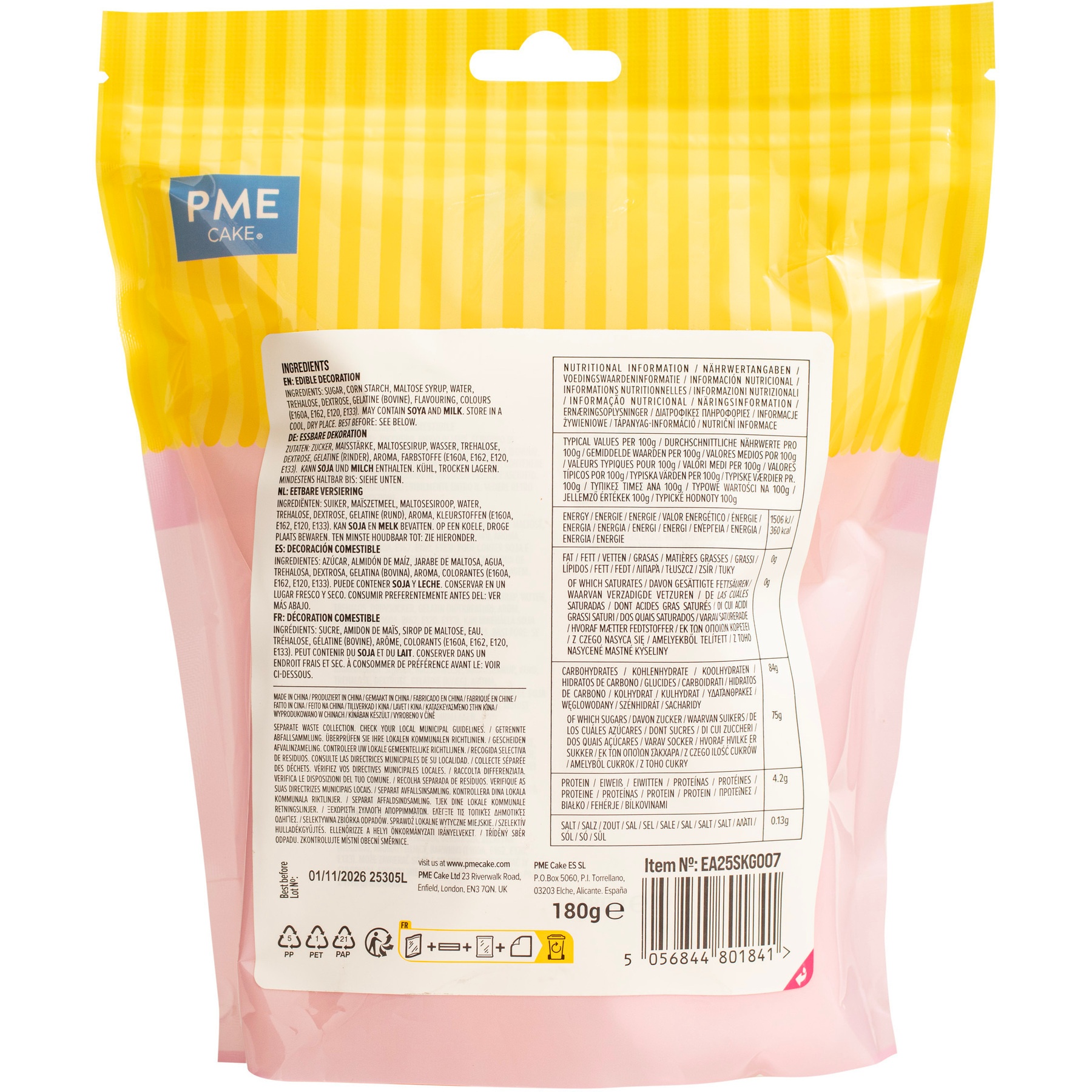 Zutaten: Zucker, Maisstärke, Maltosesirup, Wasser, Trehalose, Dextrose, Gelatine (Rind), Aroma, Farbstoffe (E160A, E162, E120, E133).