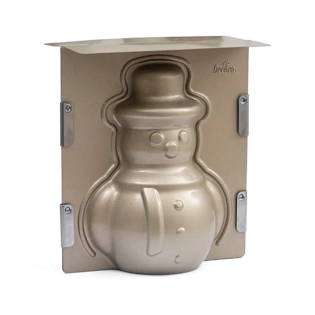 Stabile Metallform zur Herstellung einer dreidimensionalen Figur eines Schneemanns. Sie besteht aus 2 Teilen, die zusammengefügt werden, um sie im Ofen auf dem Kopf stehend zu backen, damit sie ihre Form behält.