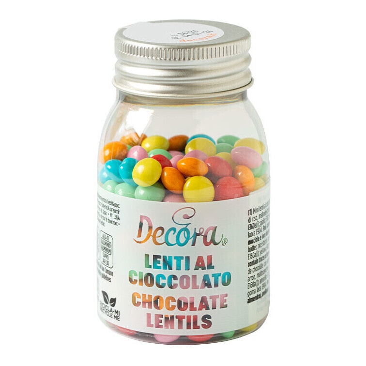 Zutaten: Zucker, Milchpulver, Kakaomasse, Kakaobutter, Reisstärke, Maltodextrin, Emulgator: Lecithin aus Soja, Aroma, Farbstoffe: Rosa: E120; Türkis: E133; Orange: E160a(i); Gelb: E101; Grün: E101, E133; Rot: E120, E160a(i); Überzugsmittel: Carnaubawachs E903, Schellack E904.