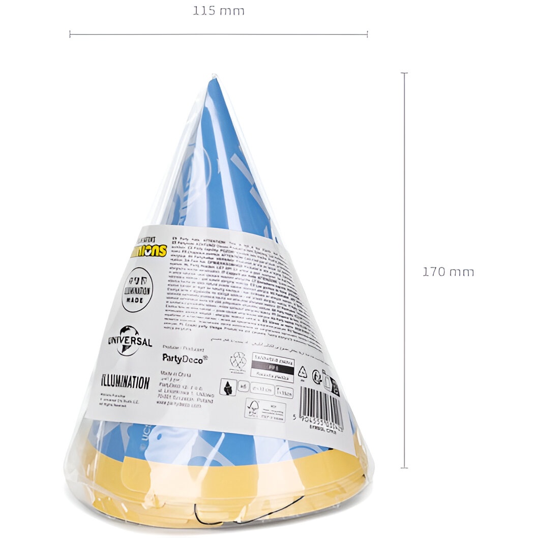 Offizielle Minions-Kegelhüte mit blauem Design und den bekanntesten Figuren. Leichtes, bequemes Produkt mit klassischer Silhouette, das sich schnell aufsetzen lässt. Ideal, um Ihre Kindergeburtstage und thematischen Fotoshootings zu beleben. Lizenzprodukt, das jeder Feier einen fröhlichen und wiedererkennbaren Akzent verleiht.