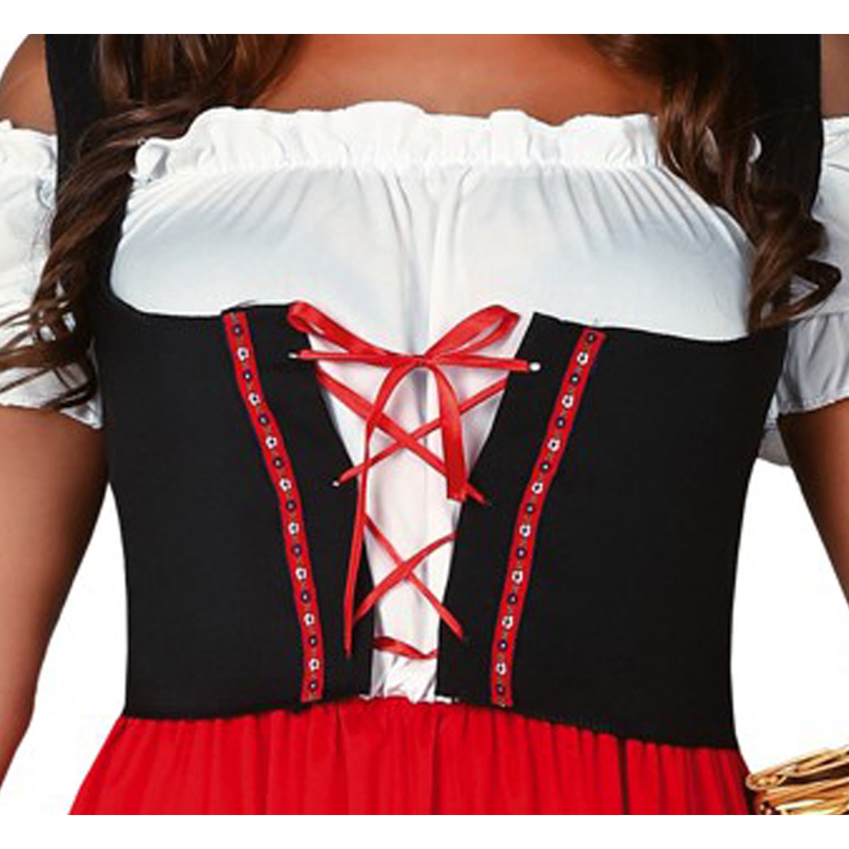 Mittelalterliches Bauernkostüm für Frauen, mittelalterlicher Stil. Dieses mittelalterliche Bauernkostüm besteht aus einem Kleid, das Oberteil ist weiß und hat Raffung am Hals und an den Ärmeln. Auf der Höhe der Taille hat es einen Gummizug, um sich dem Körper anzupassen und der rote Rock beginnt.
