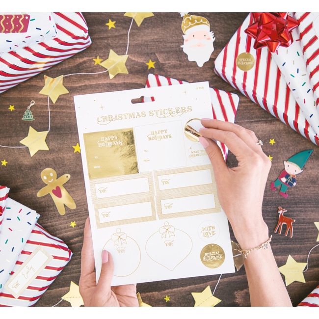 Stilvolle Aufkleber in Weiß und Gold für Geschenkpakete.