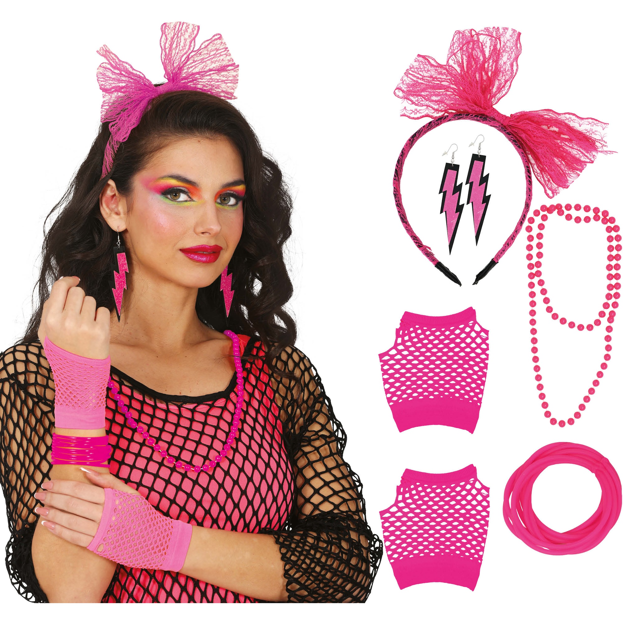 Erobern Sie die Tanzfläche mit einem farbenfrohen Retro-Look dank dieses Accessoire-Sets im 80er-Stil. Neonfarben und markante Formen verleihen Ihnen einen sofort wiedererkennbaren, gewagten Stil. Die Teile sind leicht und bequem und wurden dafür entwickelt, die ganze Nacht getragen zu werden, ohne an optischer Wirkung zu verlieren. Ideal kombinierbar mit 80er-Make-up sowie Netzteilen oder kräftigen Farben für ein besonders authentisches Ergebnis.
