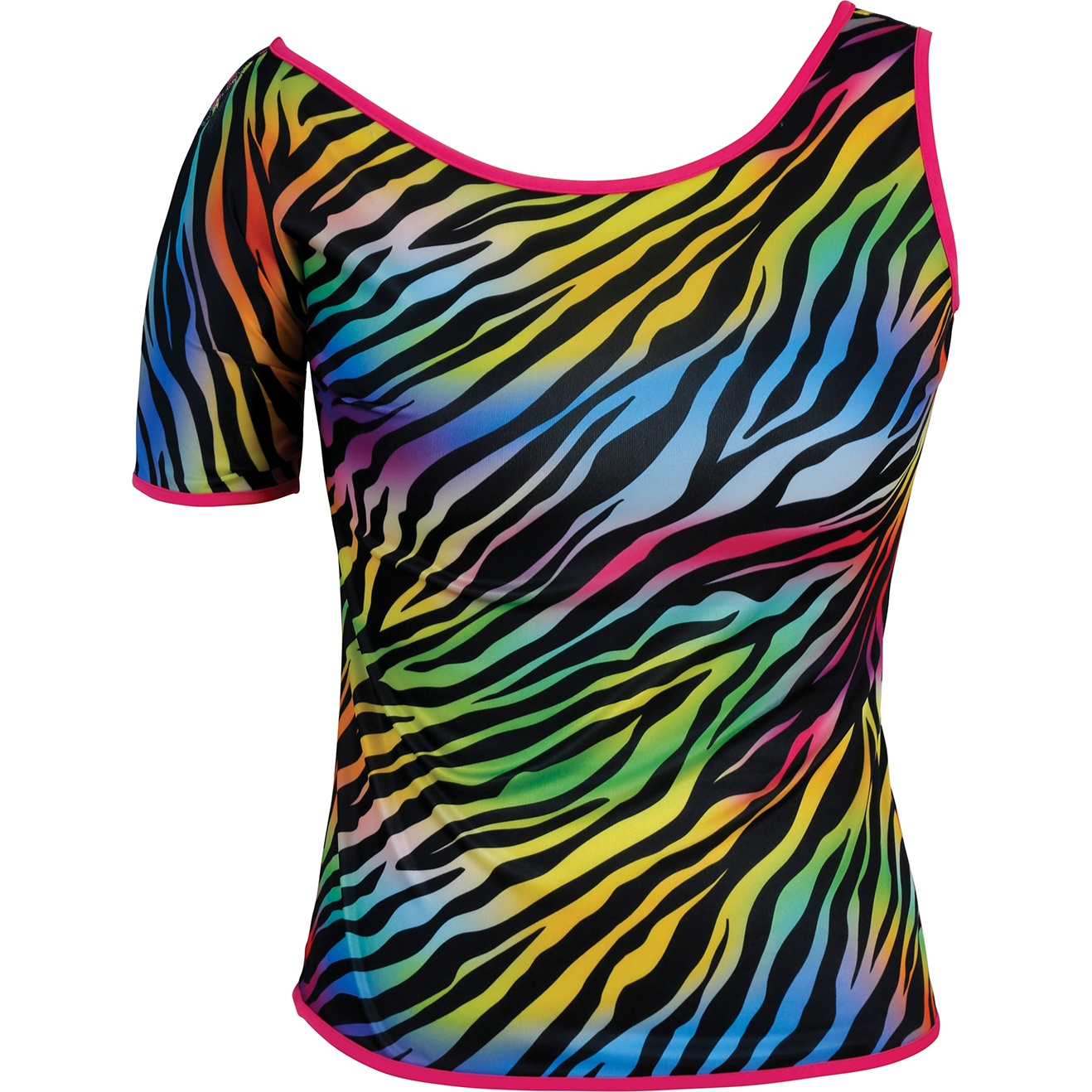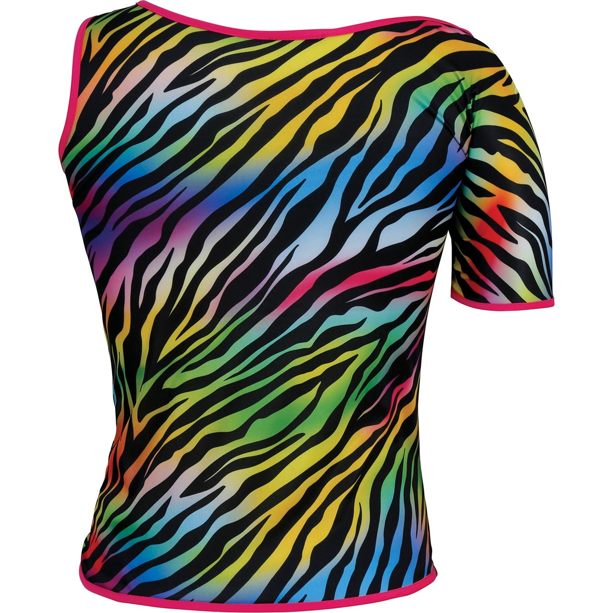 Bringen Sie Farbe auf die Tanzfläche mit diesem neonfarbenen Zebra-T-Shirt im 80er-Stil. Sein lebhaftes Muster und der pinke Besatz machen es zu einem auffälligen Teil, perfekt für Retro-Looks. Das Design mit asymmetrischem Ausschnitt und kurzen Ärmeln verleiht dem Shirt einen dynamischen, nostalgischen Touch. Ein Kleidungsstück, das auffällt und sich mühelos mit Party-Accessoires kombinieren lässt.