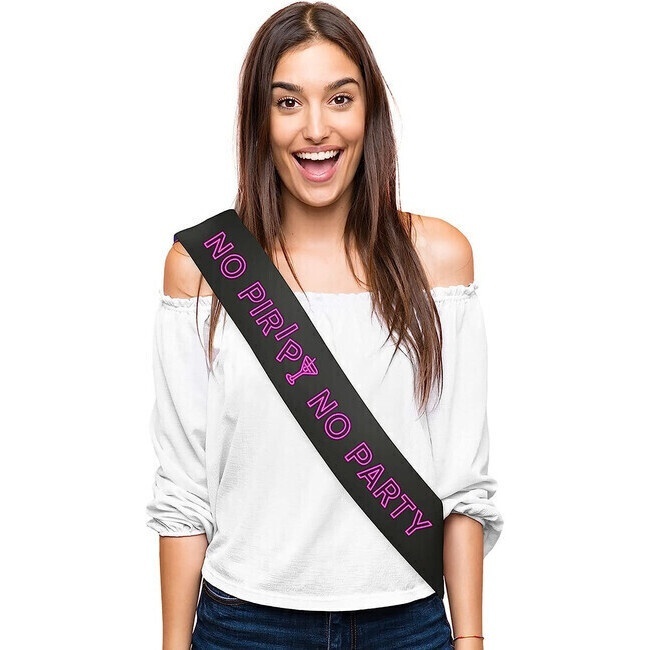 Ideales Band für jede Feier mit der Aufschrift No piripy no party, inklusive eines rosa Bandes, das am unteren Ende des Bandes angebracht werden kann, um die Größe des Bandes leicht an den Körper anzupassen.