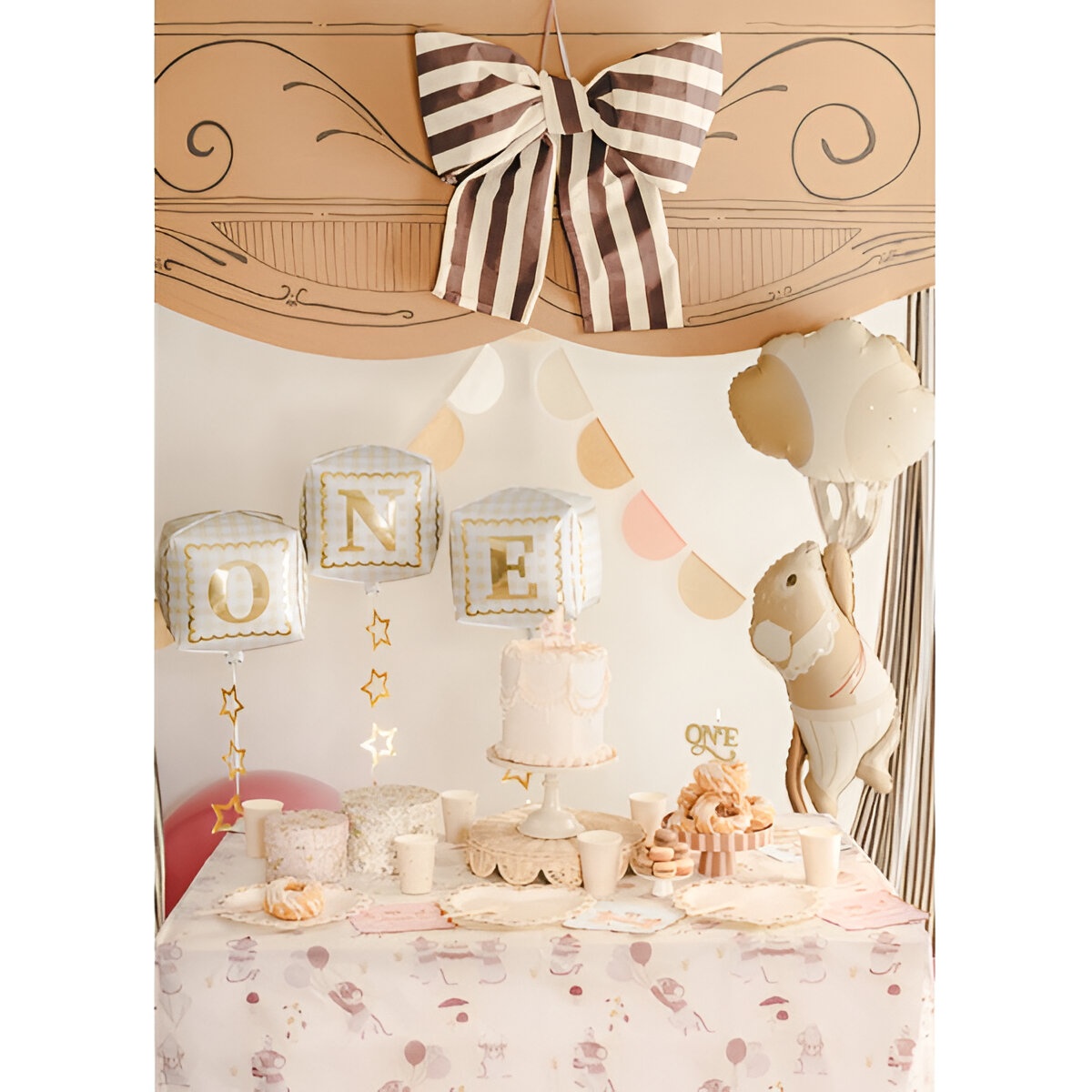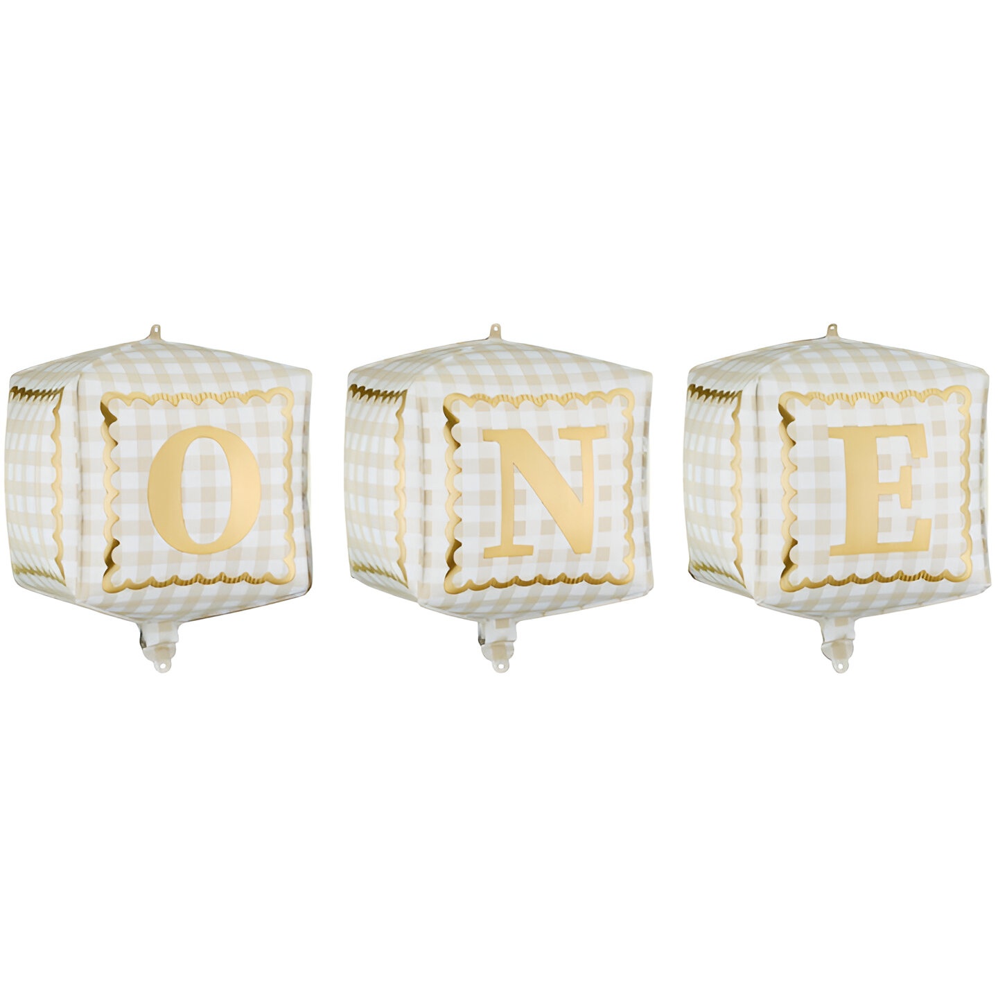 Elegantes Set aus kubischen Folienballons. Gold?weißes Design mit den Buchstaben "ONE" für einen festlichen, edlen Akzent. Maße vor dem Aufblasen ca. 28,5 x 53 cm; nach dem Aufblasen ca. 30 x 33 cm. Geeignet für Luft- und Heliumbefüllung; das Folienmaterial bewahrt Glanz und Form. Ideal, um für Sie eine auffällige und elegante Hintergrunddekoration bei Kinderfeiern zu gestalten.