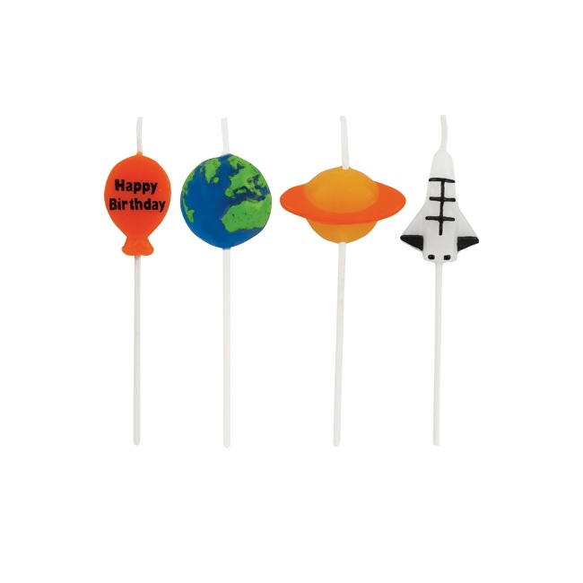 Ein Set von 4 Kerzen in verschiedenen Formen mit einem Weltraumthema.