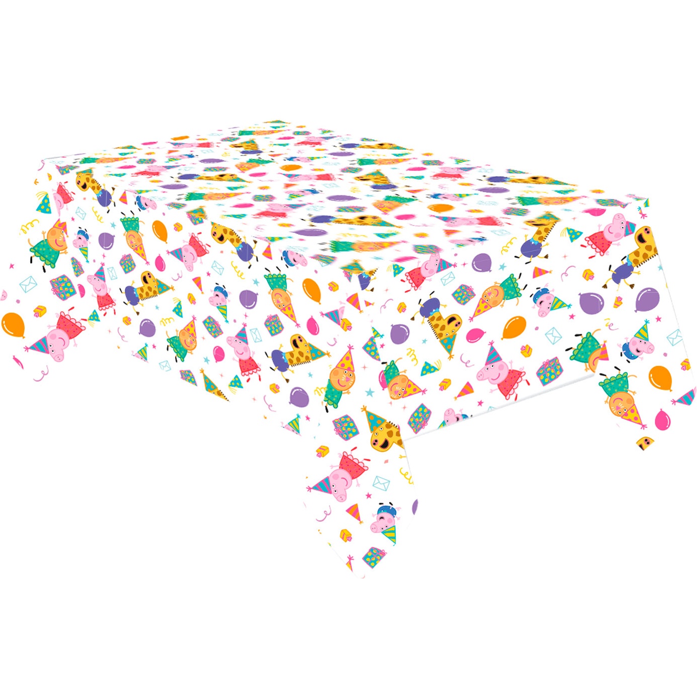 Einweg-Tischdecke mit fröhlichem Peppa Pig-Motiv in bunten Farben und festlichen Elementen.