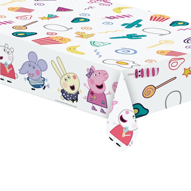 Diese Tischdecke mit weißem Hintergrund ist mit einigen Figuren aus der Peppa Pig-Zeichentrickserie verziert.