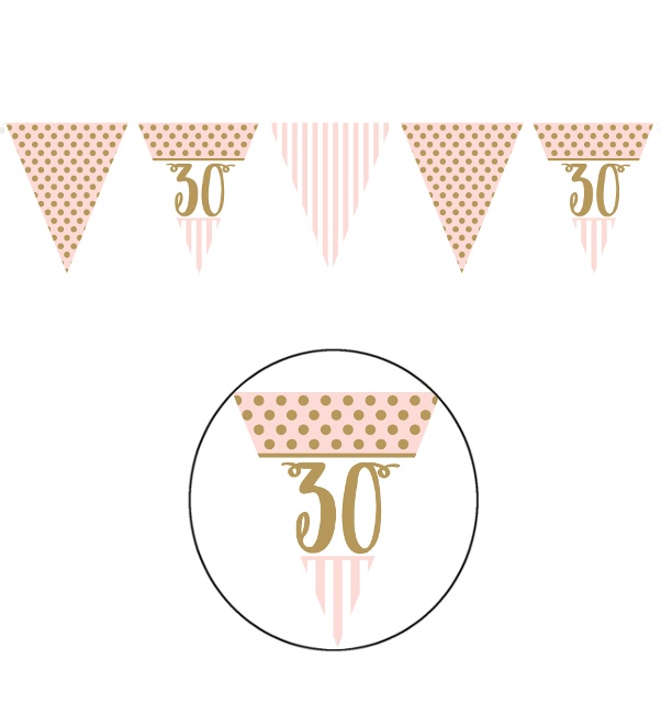Dekorative Papiergirlande, die die Farben Weiß, Rosa und Gold zu einem schönen Design kombiniert.