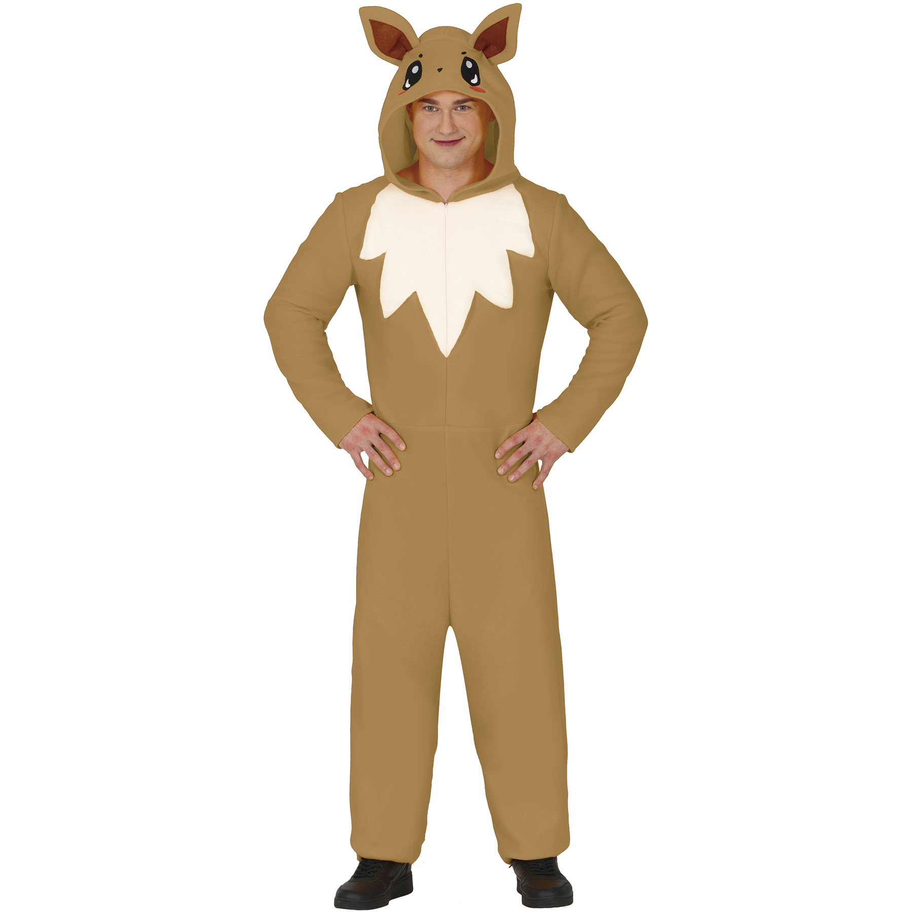 Dieses Modell erinnert an den Charakter Eevee aus Pokémon. Es handelt sich um einen Ganzkörperanzug mit Kapuze, der vorne mit einem Reißverschluss geschlossen wird.