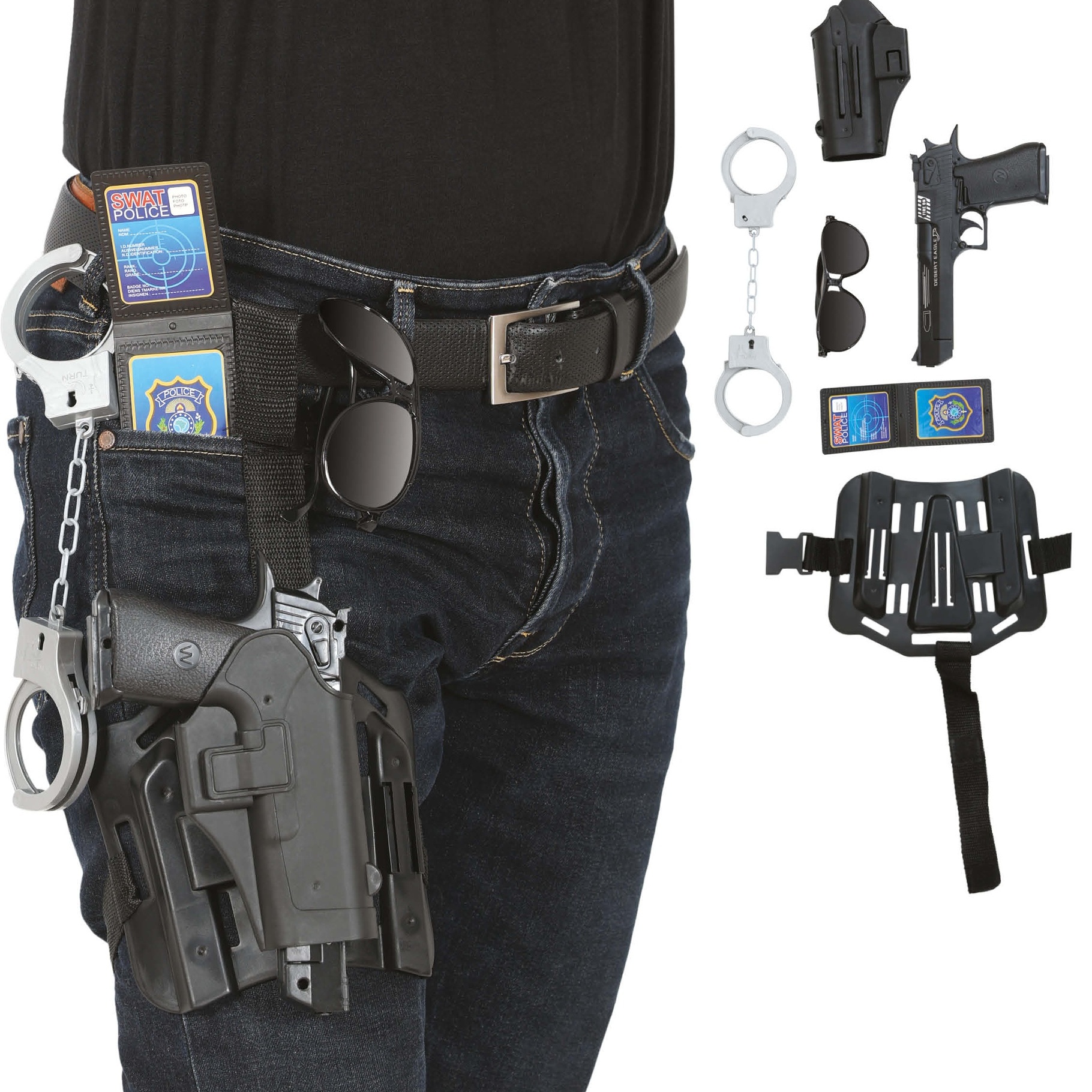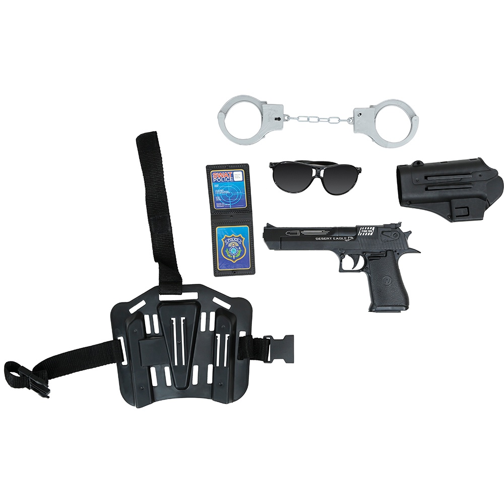 - Lieferumfang: Holster, Pistole, Sonnenbrille, Abzeichen und Handschellen