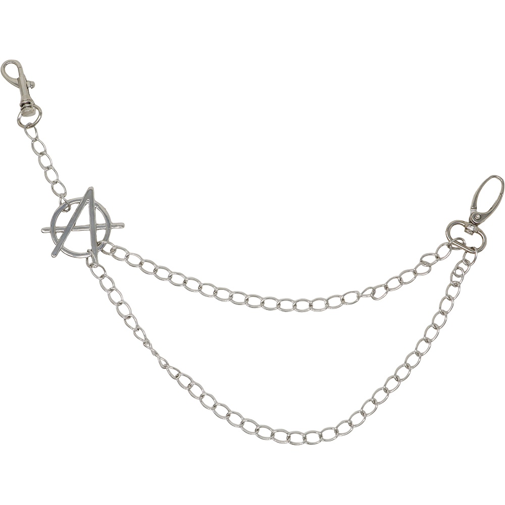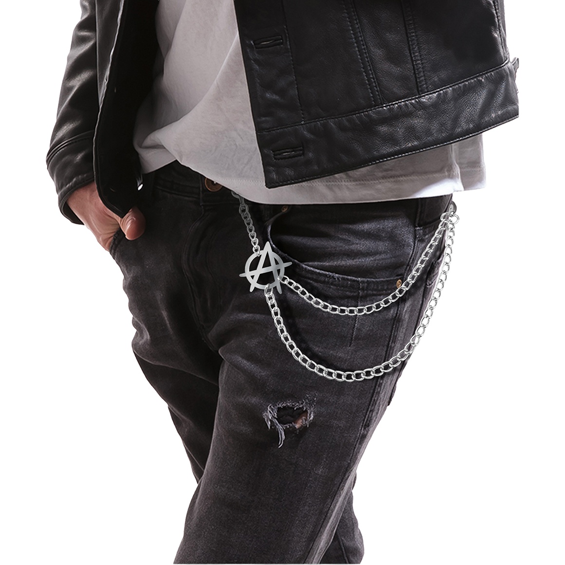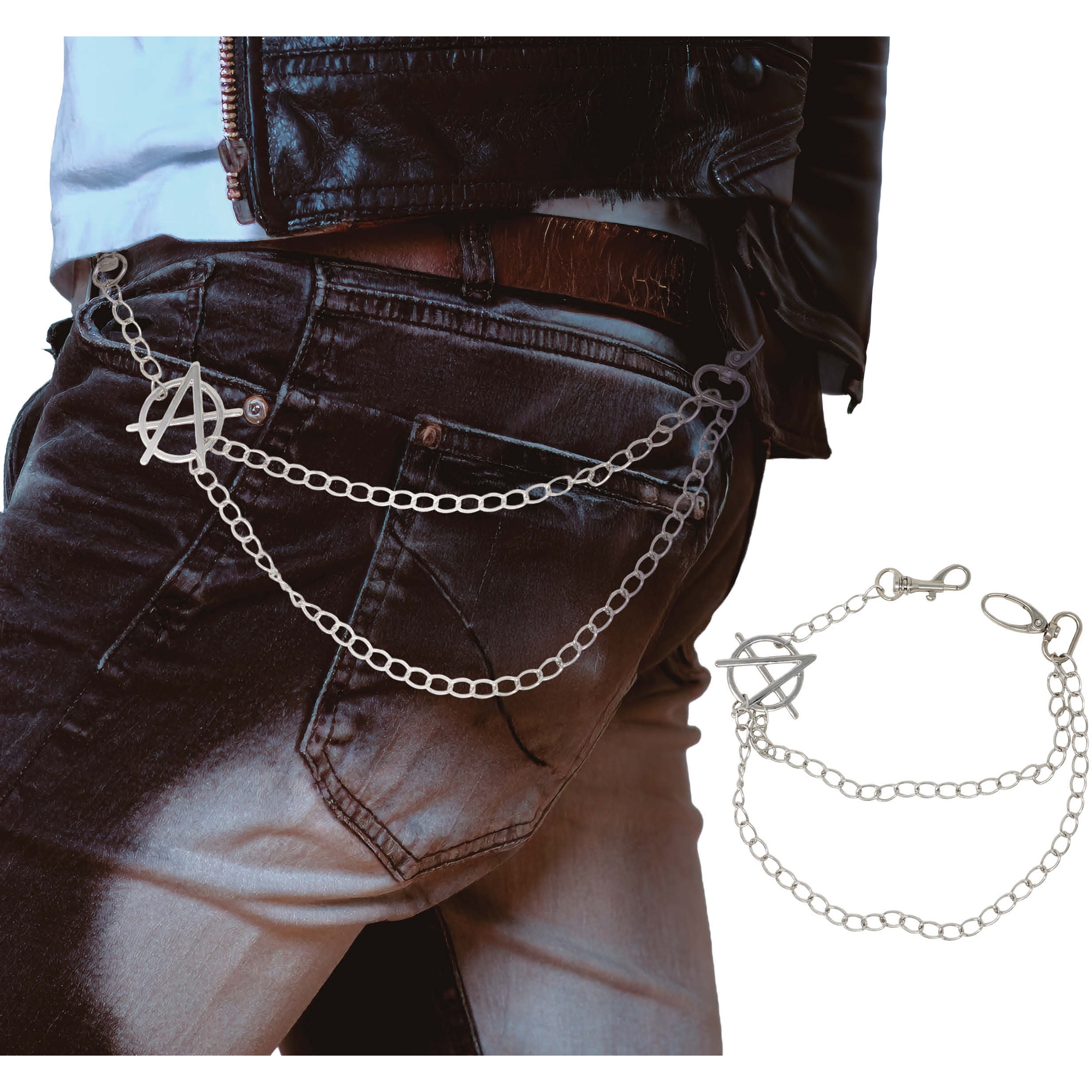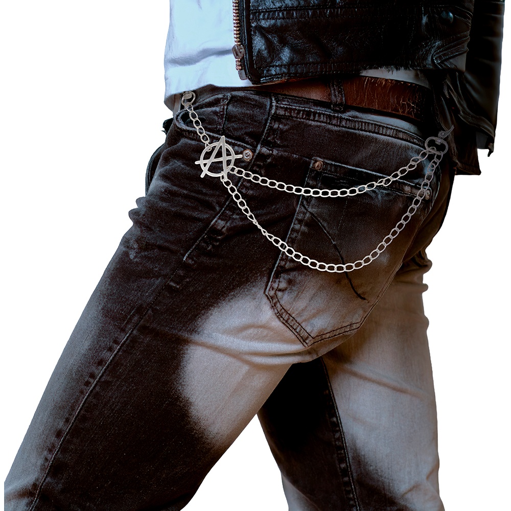 Accessoire im Punk-Stil, entwickelt, um Ihren Jeans-Looks eine rebellische Note zu verleihen. Der Anhänger mit Anarchie-Symbol und die doppelte Kettenführung sorgen für einen markanten, authentischen Effekt. Ideal für Konzerte, Ausgeh-Abende oder um einem urbanen Outfit zusätzliche Attitüde zu geben. Das Design lässt sich einfach am Gürtel oder an den Gürtelschlaufen der Hose befestigen.