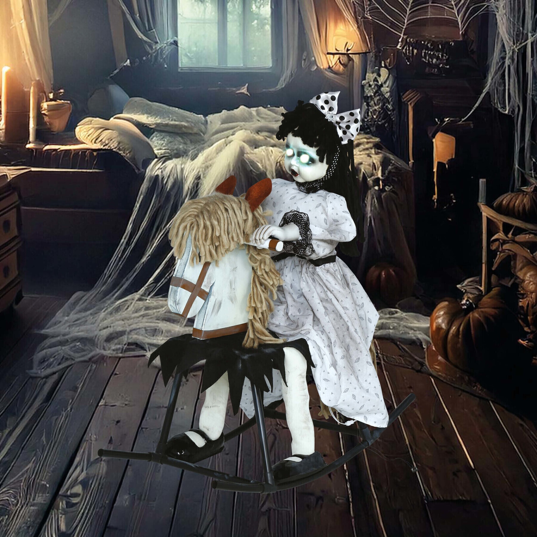 Puppe auf einem Schaukelpferd mit Licht, Ton und Bewegung, 70 cm