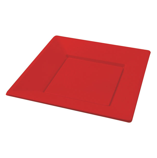Eine Packung mit 5 Stück flachen, quadratischen Tellern aus Einwegplastik. Sie sind ideal für Partys, Geburtstage oder andere Feierlichkeiten.