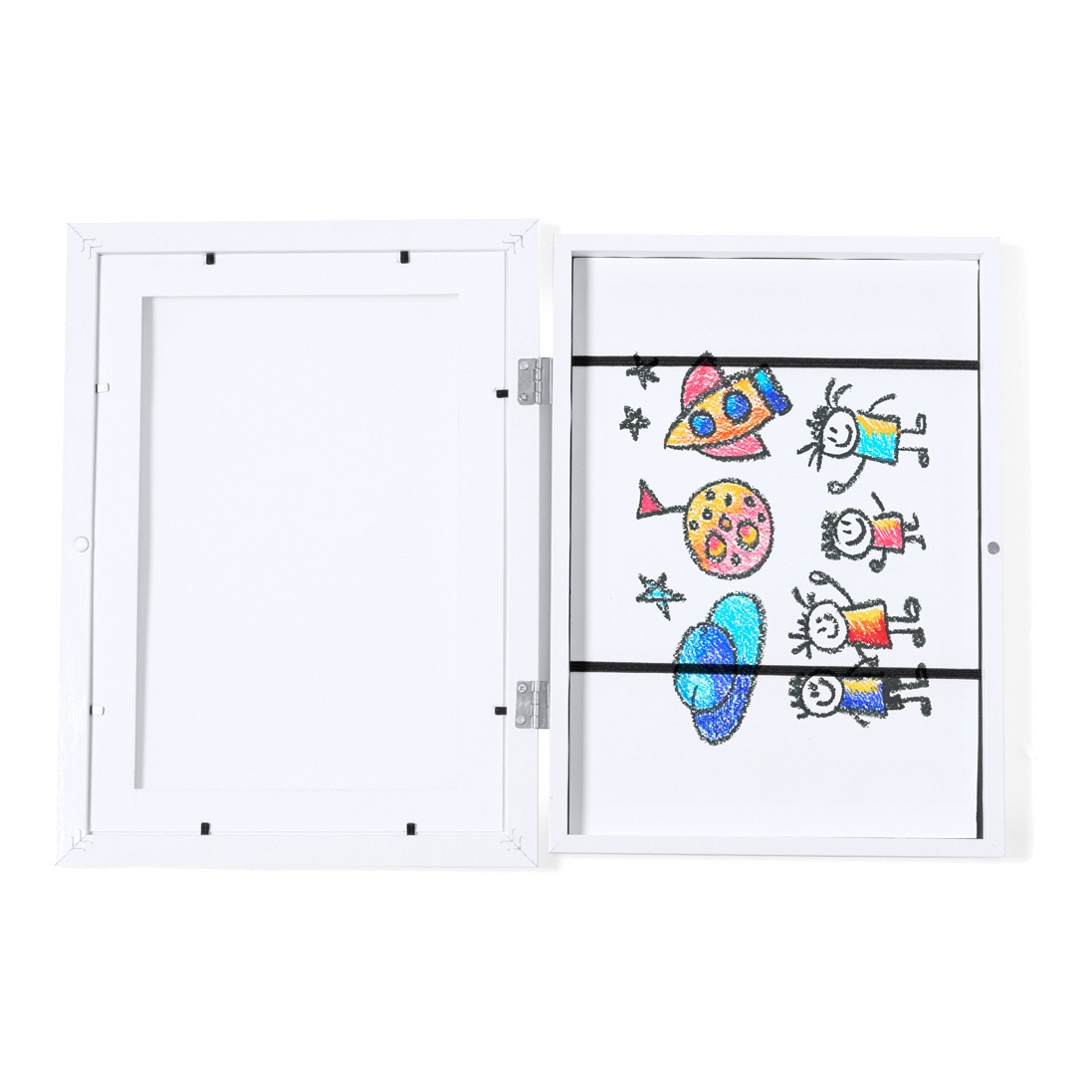 • Bietet ein Fach zur Aufbewahrung von A4-Formatzeichnungen, die durch elastische Bänder gehalten werden, während auf der Vorderseite ein Rahmen integriert ist, um die ausgewählte Zeichnung hervorzuheben.